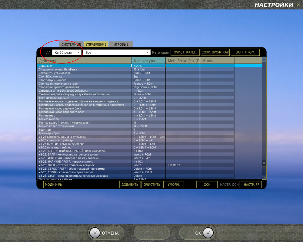 Спасибо за внимание всем, кто пытался мне помочь) Я просто уже голову себе почти ломал, ищя выход из положения) Причина была нижеследующая. В настройках есть 2 положения редактирования профайла джойстика Это КА 50 реал и КА 50 игра При назанчении кнопок и осей джойстика на профиль КА 50 игра - доступ к полной функциональности джойстика был ограничен. Назначил кнопки и оси на профиль КА 50 реал - всё заработало идеально. Вот только непонятно для чего два профиля в игре КА 50 реал и КА 50 игра? Какой то один должен быть постоянным. И путанницы будет меньше и нервов.:D Я думаю что в будущем патче для КА50 лучше оставить только один профиль КА 50 реал. Скриншот приложен) Ещё раз благодарю за внимание.