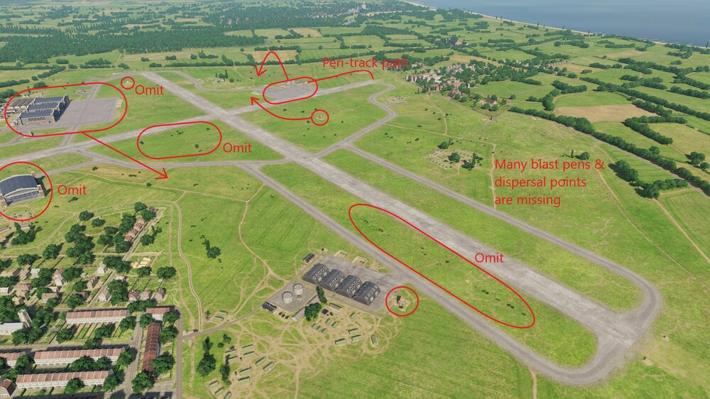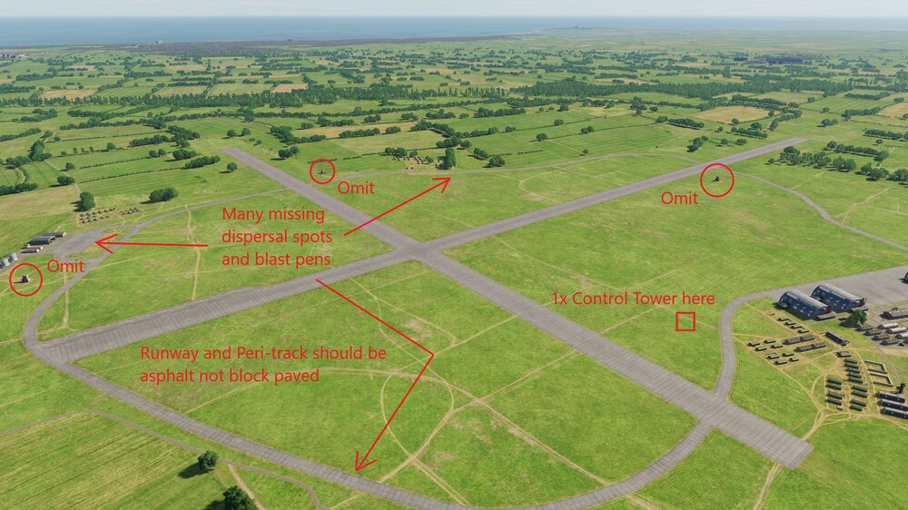 @MAESTR0 Firstly, let me say thankyou for all your teams efforts - the general layouts of the airfields look pretty good and I can see the effort that has been invested to make the airfields less sterile. After a more detailed review, I do, however, have some concerns. 1. Many of your RAF fields have too many control towers. One was the norm. In some cases there were two where the airfield topography required it because of blindspots, or where one originally built was not up to the capacity required as the airfield expanded (which they often did as the war progressed). However, they were the exception, not the rule. From the screenshots provided, Tangmere, Ford and West Malling immediately jump out as being examples of where we have a surplus number of unprototypically placed Control Towers. If you would like information on where to accurately place control towers please PM me or @Fred901 as between us we have the data to help you get it right. 2. There should be no foliage (shrubs, bushes trees) within the perimeter track. This is an instruction laid down in Air Ministry Standards long before the war. It's just not a feature of Allied wartime airfields as they present a hazard to aircraft. Please omit them from Gravesend, Ford, Farnborough and Funtington. 3. There should be no concrete block paving on the runways/taxiways. Whilst large aircraft pans were certainly paved with large concrete blocks, taxiways and runways were not. Please adjust the runway/taxiway textures to reflect this at Tangmere and Farnborough. 4. There is a lack of dispersal points and blast pens on some of the large airfields. Tangmere and Ford had provision by 1944 to support 9-12 squadrons each of 18-20 aircraft - this needed a LOT of real estate dedicated towards parking spots for aircraft. These could be as simple as a small poured concrete circle, many of which were in evidence at these two airfields but are missing in your reproductions. So too the blast pens, these dating from pre-1940 and a very distinctive feature on many RAF airfields of the time. Please conside adding some of these in. All the above can be summarised in these annotated drawings of Ford and Tangmere respectively: The layout is 75% correct regards runways and taxiways but the areas where the hangars are is wrong by some margin. Also note the foliage and compared to period plans there's a dearth of places to park aircraft. Tangmere best displays the over-abundance of Control Towers and again, the lack of aircarft parking spots. 5. Incorrect hangar types. Please see my original post on this matter here. I do see a change has been made to the large hangar type being used throughout the RAF airfields from this: to this: But even this generic hangar looks little like any example on any British airfield. In addition, it's uselessly too tall! The only reason you'd have a hangar that high is because you were expecting to put a tricycle undercarriaged bomber sized aircraft with a very tall single tail in it, yet that framed glass full width transom window prevents any aircraft from utilising the height within - it doesn't make much sense. Please, please, PLEASE consider making an accurate 3D model of a single bay Belfast Truss instead; a 2 bay version is shown below: This would be FAR more prototypical for all the airfields shown and I wouldn't grumble if it appeared on other airfields in lieu of their actual hangar because at least it was of a period prototypical pattern.