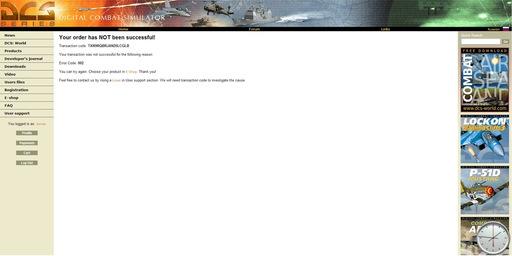 Today I bought Combined Arms without receiving any codes except Error code 002. I also had the login problems: after login in, all tabs on the left would leave me logged in, except the e-shop tab. I just kept trying login in and out (I'm not going to quit buying something because there were some login problems) finally it worked, I payed by paypal. confirmed the payment, no problems and then bam, a was redirected to the error 002 page. checking the mailbox I got the confirmation from paypal. I opened a ticket sending screenshots from both error and payment confirmation. Both screens are in the attachment -
