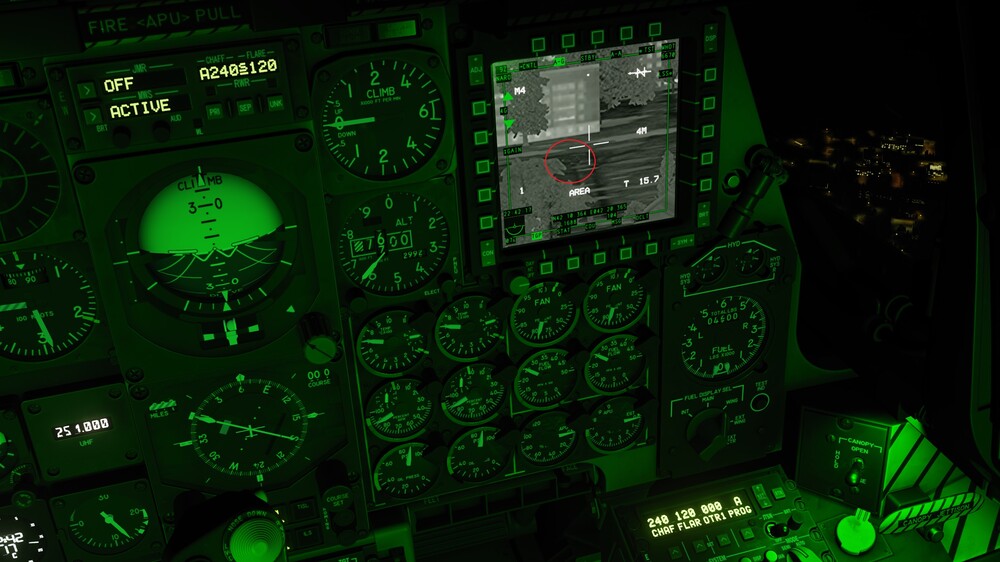 Опять про TGP.Летал одну миссию ночью.Искал танки,искал,искал...Прилетели союзные вертушки,сделали всё за меня.Сгоревшие танки,зу-23,видно раз в десять лучше целых. Ореол сгоревшей травы даже отлично видно.Ночью стало чудовищно тяжело работать.