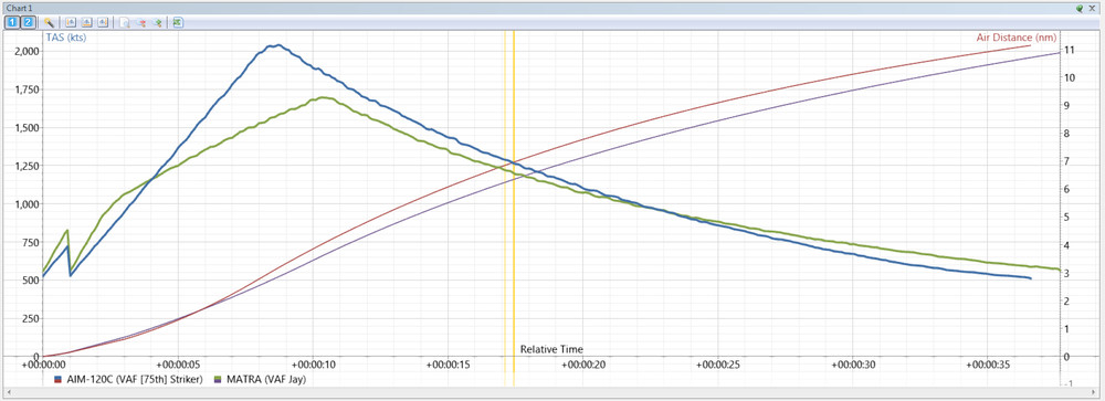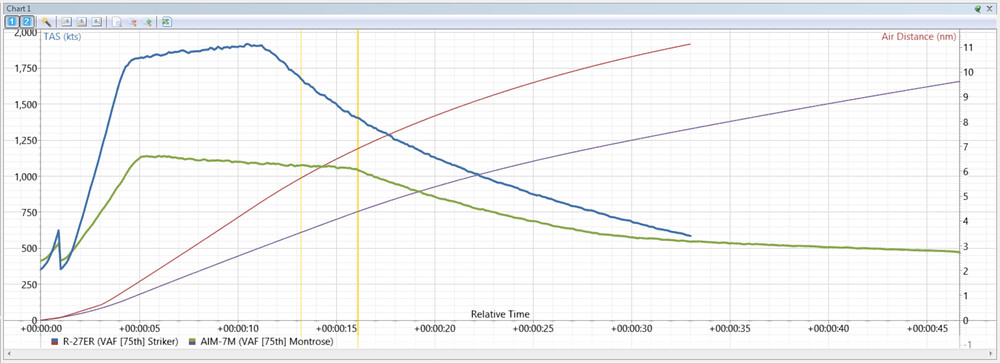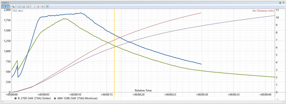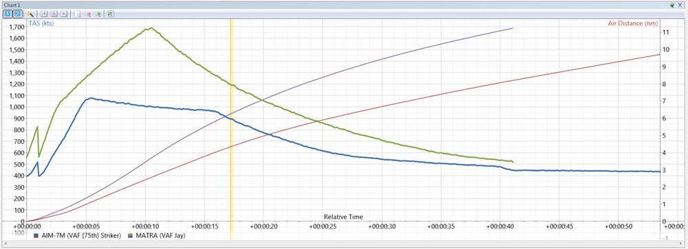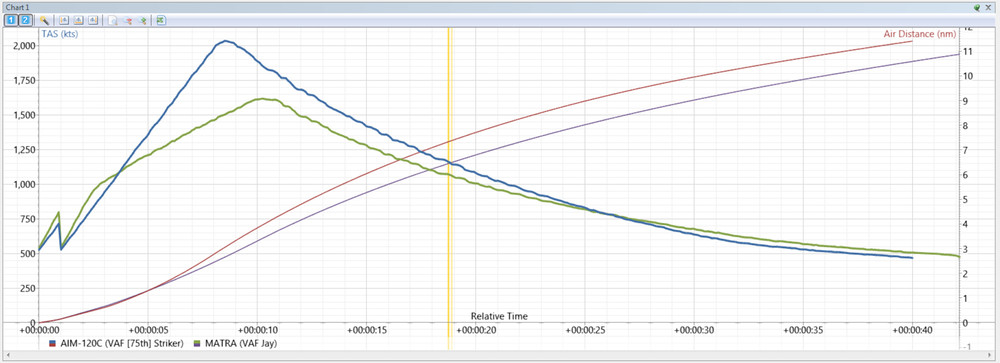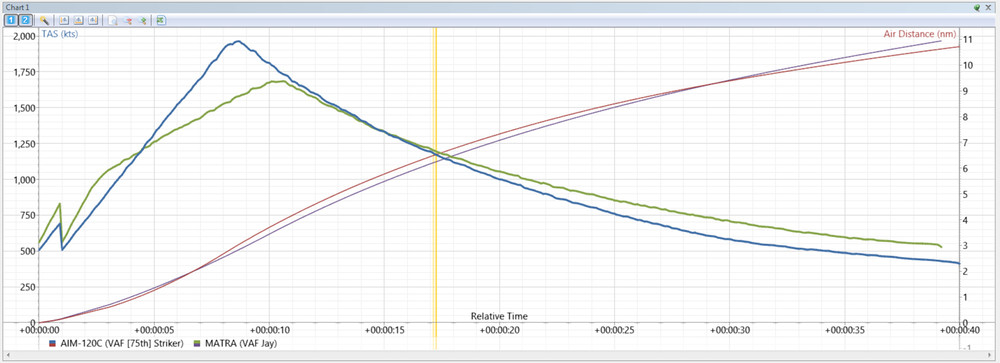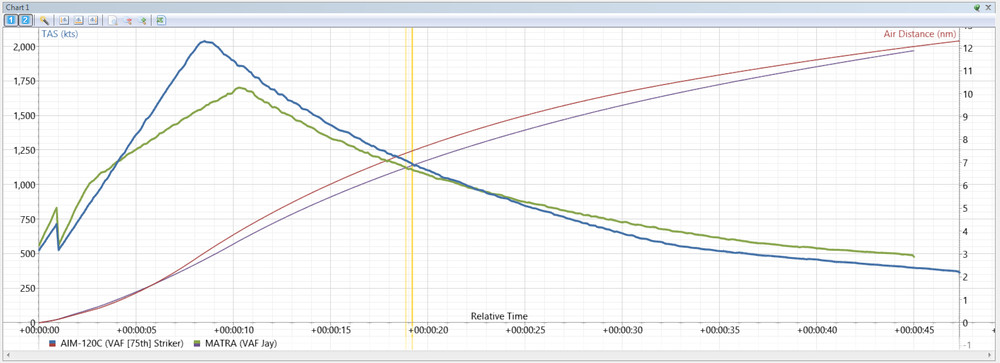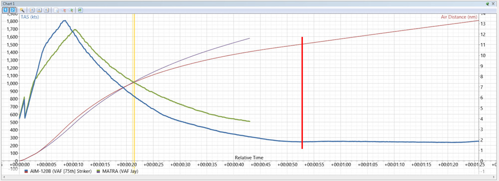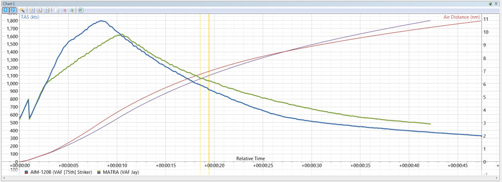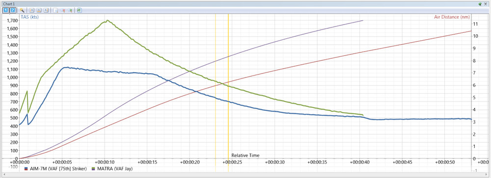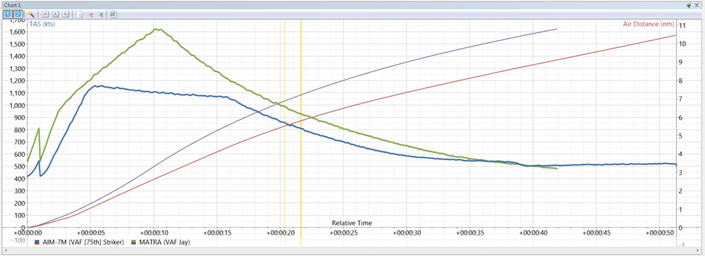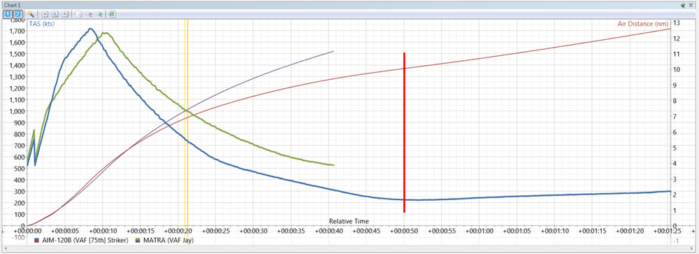 3. Introduction Hey fellow DCS virtual pilots, thank you for taking the time to read our document on the flight distances and speed of the various air to air missiles in DCS World. First of all I would like to clarify that this document is not for any official use and is simply a helpful guide for virtual pilots to use when deciding to pick various load outs. Some of the motivation to do the extensive testing we did came out of our desire to understand weapon limitations and the best way to counter or leverage these limitations. The data did help us understand our engagements and how better to deal with different threats and although we primarily fly the Hornet in A2A, this information is useful to pilots that chose to fly the Mirage, Su-27 or F-15C. Also, please be aware that although there is always going to be some bias regarding platforms, we did our best to limit it to the point that it did not have any effect on our evaluation testing. These tests are NOT meant to prove the ability of one pilot over another pilot. The tests are simply to show the performance of each missile based on the exact same or as close as possible to the exact same parameters for both platforms. There are also some differences in initial missile speed that we cannot account for even though both platforms are traveling at close to the same speed. But it appears that some have a slightly higher or lower off the rail speed. There is no way to simulate all of the different maneuvering techniques used in A2A combat so it wasn't even attempted. We tried to use the best practices in our testing. All engagements were done from either the same altitude or from altitudes that were reversed and also at the exact same indicated air speed and the missiles is fired at the exact same time or as close as possible. All of the telemetry charts are pulled directly from Tacview and the missiles are all set to "relative" time. They show the exact time of launch, flight time and impact time. In a couple cases the impact time had to be estimated. We do not feel that it made the test irrelevant again because we were looking for missile flight time and performance only. Pilot skill is not factored into any of the testing. Originally we planned on exporting the data from Tacview into Excel spreadsheets for comparison but it's really impractical to do so. All of the information is in the Tacview files and they are zipped up and kept safe as an attachment for anyone to view them. We did all of our testing in sequenced routines to produce one Tacview file at a time so they wouldn't be suspected of being tampered with. The Hornet / M-2000C is one complete file, the F-15C / M-2000C is another, and the Su-27 / Hornet is one other. Test Setup DCS Version: v.2.5.3.21708 Map: Caucus Default weather conditions, no wind. Test Results F/A-18C vs M-2000C (end of graph line is impact point) The first set of tests between the F/A-18C Hornet and the M-2000C are all done at 10,000 feet with a indicated air speed of 350 knots and a pure head on aspect. They were also fired at as close to the exact same time or as close as possible just inside shoot cue range between 15 and 16 miles. Radar locks were maintained for the entire flight of the missile. Case 1 In this first chart you will see the AIM-7M launched from the Hornet against the Super 530D fired from the M-2000C. The S530D achieves a peak speed of 1,700 kts while the AIM-7M only reaches about 1,100. The significant difference is how long that the S-530 can sustain a higher speed allowing for a 13 second difference in impact time. Case 2 The second test between these two aircraft was done with the AIM-120B and the S530D. In this case the performance ability of the AIM-120B is definitely better than the AIM-7M. They both achieve a close peak boost speed. The significant difference is the mid-course speed of the S530D. It sustains a much higher velocity allowing it to reach the F/A-18C 6 seconds sooner than the AIM-120B reaches the M-2000C. It was also observed that up to 8 nautical miles the missiles are nearly equal in terms of distance traveled after launch in the same amount of time. Case 3 The third test is with the AIM-120C and the S-530D. The AIM-120C has a higher peak speed but the S530D has a better mid-course sustained speed. This makes the two fired at the same time almost equally matched on their impact point. Maneuvering Cases The next set of tests between the F/A-18C Hornet and the M-2000C are all done at 10,000 feet with a indicated air speed of 350 knots and a pure head on aspect but turning to a 30 degree gimbals immediately after firing the missile. They were also fired at as close to the exact same time or as close as possible just inside shoot cue range between 15 and 16 miles. Radar locks were maintained for the entire flight of the missile. Case 4 In this first chart you will see the AIM-7M launched from the Hornet against the Super 530D fired from the M-2000C. The S-530D achieves a peak speed of 1,700 kts while the AIM-7M only reaches about 1,100. The significant difference is how long that the S-530 can sustain a higher speed allowing for a 13 second difference in impact time. The other significant part of this test may be due to some of the missing ability of the F/A-18C radar currently. It may also be due to missile turn ability. But the AIM-7M never actually impacted the target. It missed by several hundred feet even though the Hornet maintained a constant radar lock. So from whatever reason unknown, the M-2000C turning to a 30 degree aspect somehow caused the missile to miss the target. The difference in impact time can only be estimated but 11-14 seconds should be fairly close to accurate. Case 5 We found similar results from the AIM-120B launched from the Hornet against the Super 530D fired from the M-2000C. Again, the peak speeds are similar but the significant difference is the cruise speed of the S-530D. It is able to sustain a much higher rate causing an estimated 7
