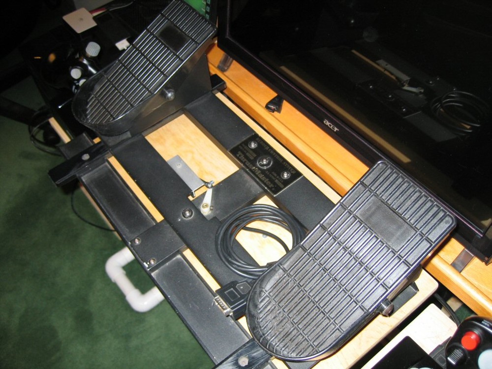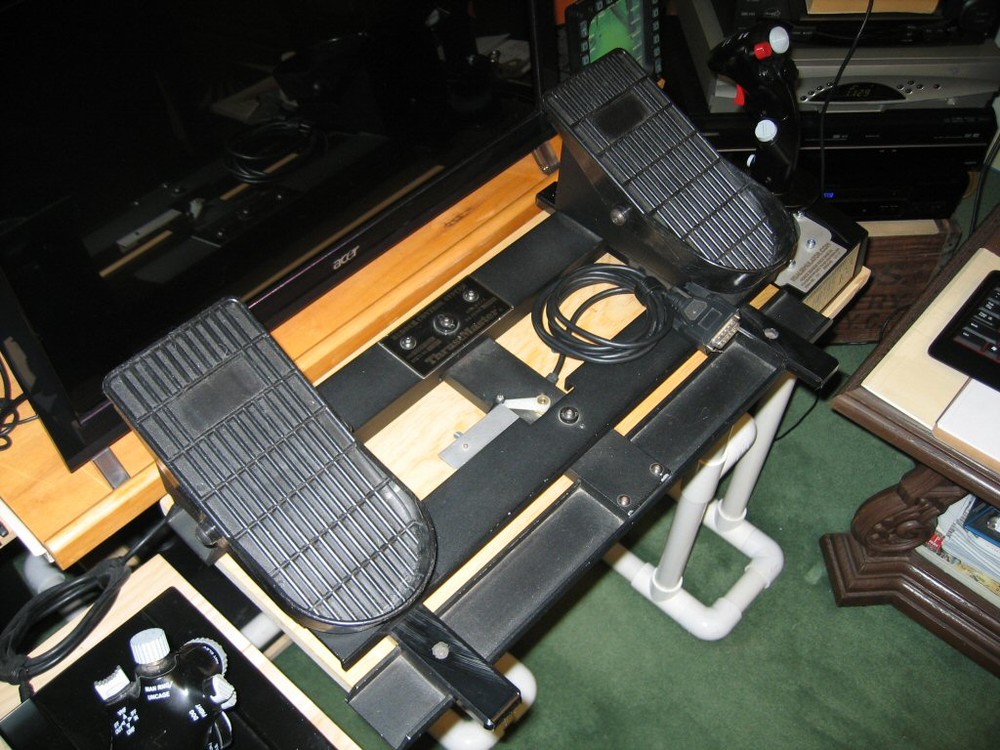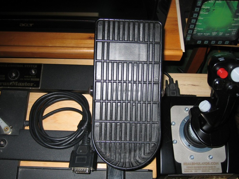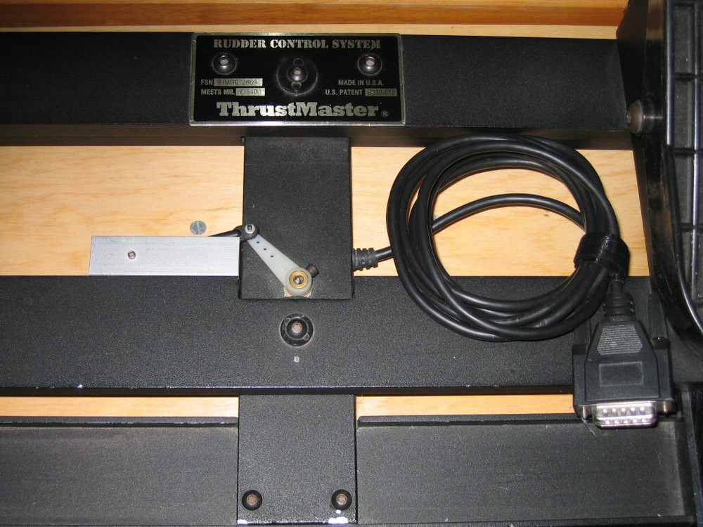 I have a ThrustMaster Rudder Control System (RCS) for sale to someone in the continental USA. This TM RCS set of rudder pedals has Cubby Smith's Hall Sensor upgrade installed, so they are very smooth and will never suffer from pot spiking like the stock ones may do over time. The TM RCS was designed specifically to connect directly to a HOTAS Cougar and be calibrated directly with the Cougar Control Panel (CCP), so they work superbly in that configuration. Cosmetically I would rate them ~7-8 and functionally 10 on a 10 point scale. I am asking $100 US OBO and the buyer pays the shipping. Please PM me if you are interested. Below are some photos that I took of this TM RCS earlier today: