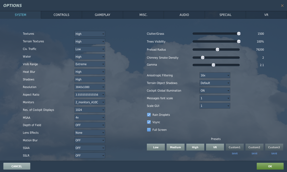 Well, I've fiddled and tweaked until I'm blue in the face and I'm still unable to get the current DCS looking realistic/natural. The only thing I can think of at this point is that the DCS team is developing on monitors/TVs that far exceed the technology that my 9 year old 46 inch 1080P TV is capable of. Maybe it's time to upgrade, BUT I've tried before. My problem is that I like using a large display, and large monitors (40+ inches) are prohibitively expensive coupled with the fact that 1080P TVs are pretty much a thing of the past. I don't want to give up Helios because I love my glass cockpit controls, so now in order to upgrade, I'm looking at trying to run DCS on a 4K TV plus running Helios on a second 1080P touch screen. Running DCS smoothly on 4K alone will be a challenge, let alone trying to render an additional 1080P touch screen at the same time. Maybe when the 3080ti cards come out things will change. I guess time will tell:-) -
