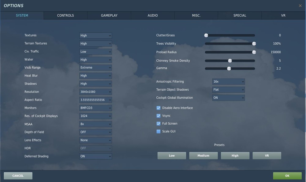 Hi all. So, I scrimped and saved for years and dropped a good bit of money on what I thought would be the ultimate PC build specifically for DCSW 2.5. (See specs in my signature.) The goal was to be able to run DCS stutter free at 60+ fps with all the eye candy turned on in even the most graphically challenging areas of the maps, like flying over Las Vegas downtown at low altitude for instance. I've pretty much achieved that with the rig I built when NOT using Helios and utilizing only one screen, but with Helios running on my 27" touch screen at 1920x1080 plus the main screen at 1920x1080, everything gets skippy stuttery, even with a 1T m.2 PCIE SSD, a Titan X Pascal, 32GB of RAM and an I7-8700K. Overclocking to 5+ GHz only made it worse. *sigh* I'm beginning to think that a supercomputer won't even do it. I don't see that any of my cores are getting maxed out, and I would think that the Titan with 12GB of VRAM should handle about anything DCS could throw at it. I do turn off everything in the system tray that's not essential when running DCS, but that doesn't seem to improve things. Very discouraged at this point - I'm like, good grief! What the hell do I have to build to achieve my dream? I know someone is going to say just run one screen and use the mouse to click on the controls, but I've found that TrackIR and Helios are a must for me for immersion, and I'm not really into VR. Plus, the following video illustrates pretty well what it's like when I try and use the mouse and TIR at the same time:-) http://www.youtube.com/watch?v=CQYNvEPi9-s?version=3&start=75&end=102&autoplay=0&hl=en_US&rel=0 Have any of you Helios users been able to build a rig that will run two screens stutter free with the highest graphics settings? I periodically see people talk about lower frame rates of 30 or so fps, for instance, but is that a steady 30 fps without lag and stutter, or is it choppy? Sometimes I still get stutter even when maintaining 60 fps with vsynch on. I see folks discussing running 4K smoothly with very high settings, but I can't seem get two 1920x1080 screens to work for me and run smoothly unless I start trimming settings back. If any of you have been able to achieve stutter free performance with Helios running and very high settings, then any tricks or suggestions you might could share with me would be truly appreciated. Or maybe it's just not possible. Hopefully I'm just doing something fundamentally wrong that you guys might be able to help me with.