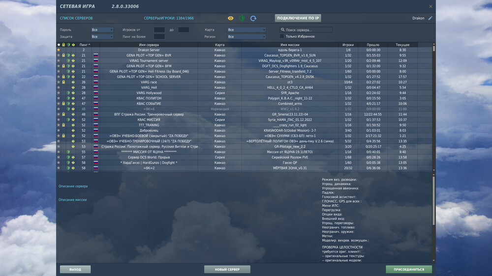 сервер запущен! IP 89.189.178.66:10308 Drakon Server версия 2.8 Запустил сервер, игроки против ботов, миссии называются "вдоль берега". кампания миссий на 5-6 (пока в тесте 4) - следующая зависит от предыдущей, возможен откат назад, если вдруг боты выиграют... Основная концепция кампании: пред стартом каждой миссии на сторону выделяются очки ресурсов. уничтожение объектов снабжения ботов (которые указаны в брифинге) уменьшают очки ботов, выполнение основного задания приводит к победе в независимости от очков ресурсов. ЛА которые занял игрок и начал взлет - отнимает очки у красной стороны (игроков), очки вернутся обратно, если вернуть ЛА обратно на стоянку, при любом другом исходе очки в красную копилку не вернуться! БЕРЕГИТЕ ТЕХНИКУ И СВОИ ЖИЗНИ! снижение очков игроков до 0 приведет к поражению - стартует предыдущая миссия, посмотреть количество очков сторон и текущее состояние не основных заданий можно в меню F10. разные ЛА имеют разную стоимость в зависимости от боевой эффективности (как Я это вижу). Не забыты любители повозить грузы! Доступны Ми8-груз и Ми24-груз - доставка груза в 1 рейсе прибавляет кол-во очков игроков, грузы нужно везти на основной аэродром базирования, на площадку, указ. в брифинге. Не забыты и любители покомандовать наземной техникой - доступно 3 штурмовые колонны, активация через меню F10, активация колонны приводит к снижению очков ресурсов! БЕРЕГИТЕ ТЕХНИКУ! оборона значительно сильнее. Один "нерадивый" игрок способен заруинить миссию, Я надеюсь, что форумчане лучшего симулятора тоже лучшие и пакостить не будут, ибо сделать отсев как на "Дорогах войны" Я не знаю как... В обороне присутствует ПВО - Роланды, Авенджеры, Вулканы, среднего радиуса - Хавк, возможен взлет вражеской истребительной авиации. ВНИМАТЕЛЬНО ЧИТАЙТЕ БРИФИНГИ и иллюстрации к ним. Баланс конечно будет правится в процессе... возможны баги - нервы у меня не железные, посему проверить все нет ни каких сил, про обнаруженные косяки пишите в этой ветке или дискорде мне Drakon#4701 предложения и конструктивная критика приветствуются!