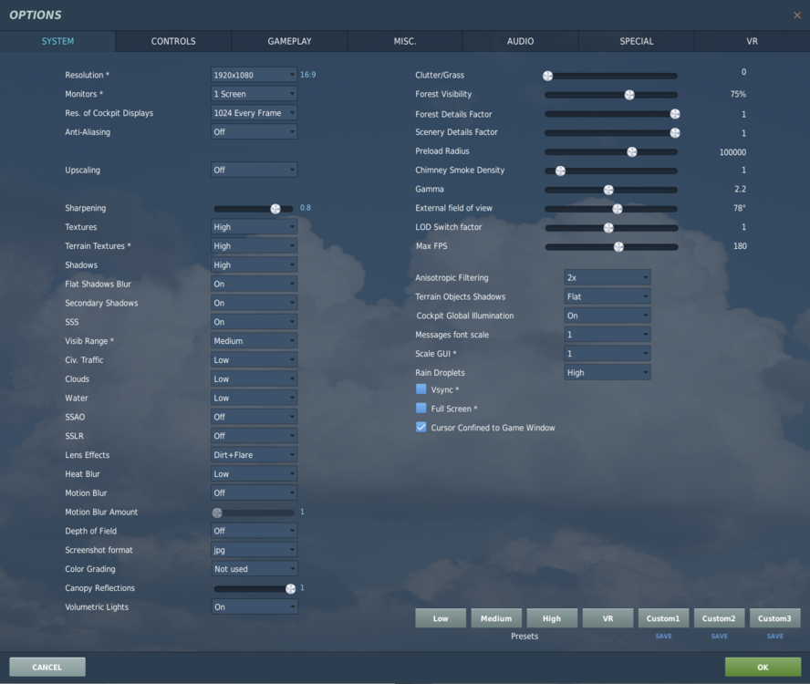 So after a couple of days experimenting I've landed on the settings that provide me with smooth SP flight on all maps, even on low level flights with a decent amount of AI assets. I don't fly MP at the moment so I can't comment on that. Hope this helps. https://imgur.com/a/y0oOXKb