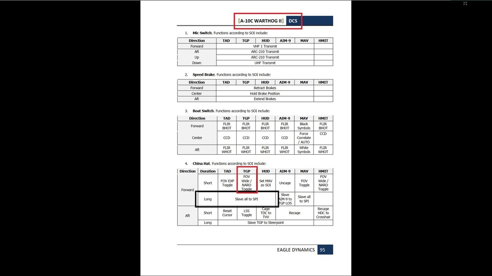 TGP + SPI + China hat forward OK, thanks for the help. The manual is from the A-10c II, now the china hat forward long in the manual indicates that everything is enslaved in the steerpoint. Unfortunately it is not happening. Suppose what am I doing wrong? -
