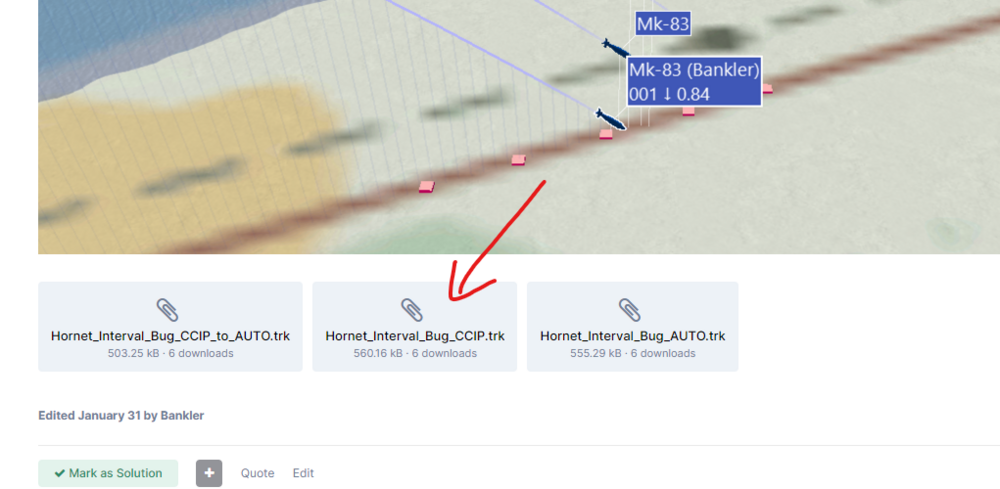Okay, here goes! Three tracks, though all show the same results. CCIP, AUTO (explicitly set) and AUTO (automatically set by being in CCIP when pressing WPDSG). Note that I'm aiming on the middle building of the five. That's where the first bomb go. I'm not sure what's correct, but AFAIK it was like this when the Hornet came out. Then it was changed so that the bombs did bracket the aimpoint (i.e number 3 out of five bombs on the aimpoint, two before and two after), but now it's back to the original implementation, and I'm curious if that is intended or not? Hornet_Interval_Bug_CCIP_to_AUTO.trkHornet_Interval_Bug_CCIP.trkHornet_Interval_Bug_AUTO.trk