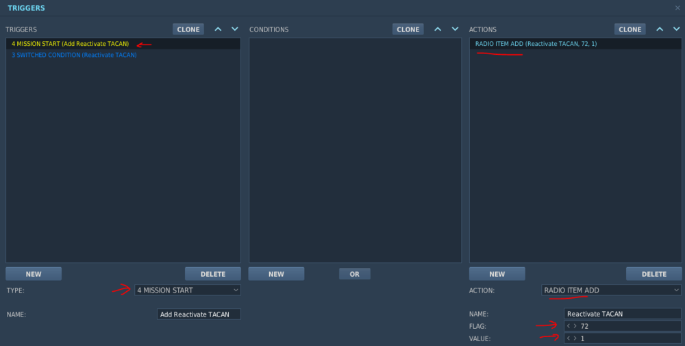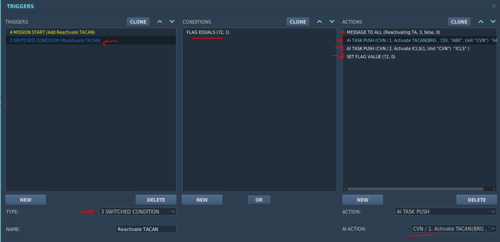 TL;DR: Use the provided .miz to be able to reactivate TACAN and ICLS on the carrier through the comms menu they stop working. For as long as I can remember, there has been a bug causing the TACAN and the ICLS to randomly stop transmitting. This can obviously be a disaster if it happens during a large multiplayer event, especially night time. Unfortunately ED has not been able to solve it, and it's rare and random enough making really hard to help out by providing any data. There have been suggestions on workarounds resetting the TACAN when the carrier group reaches certain waypoints, or putting a reactivation timer in there or so. I haven't really liked any of these solutions, because you'll still have to wait until the next reset point. And if you're on your way down during a CASE 3 recovery, you can't really wait, you need that TACAN now. My workaround uses the comms menu, adding an entry under "Other" which reactivates the TACAN and the ICLS. We have been using this for months in my community, and it has saved it dozens of times. It works in both SP and MP, any player on the server can trigger it, and it reactivates the carrier TACAN and the ICLS immediately. It can be used multiple times during a mission if needed as well. I'm providing a .miz which you can use as a template. If you want to re-create it on your own, here's how you do it: 1. Place a carrier (legacy or SC) and give it a route 2. Under "Triggered Actions" on the carrier, add the same TCN and ICLS tasks that you normally set under WP 1 Adv Waypoint Actions. 3. In the mission triggers section, create two triggers. 4. The first one should be set to "Mission Start", no condition, and as action add a radio item that sets a flag to 1. I used "72" to make it easy since I use TCN 72 and CVN 72, but you can use anything. 5. The second trigger should be set to "Switched Condition", have the condition Flag equals 1 (or Flag true), and as actions A) AI TASK PUSH (the TACAN action), B) AI TASK PUSH (the ICLS action), SET FLAG VALUE back to 0 (so it can be used several times), and (optionally) spit out a MESSAGE TO ALL saying that the deed has been done, just to confirm to the players on the server. If you want to test it, you can remove the automatically created TACAN WP 0 action from the carrier, and run the mission. Note that you can't see the TCN, but when you activate it through the comms menu, it will be there. Just don't forget to re-add the WP 0 actions again (not only TCN btw, you should probably set the ICLS in there as well), so you don't have to enable the stuff manually first time you start the mission. If you don't understand the above, just download the .miz and carefully copy what's in there, or even use the .miz as a base for your mission. TacanReactivation.miz