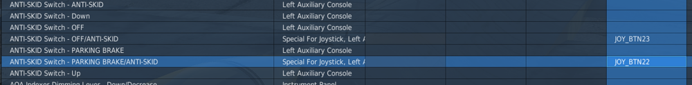 The special-for-joystick binding called "Parking Brake/Anti-Skid binding doesn't work. Binding the TMWH Flap three-way switch these two special-for-joystick bindings, the "down" position OFF/ANTI-SKID works as intended when going from the middle position and back. But the "up" position (that should select Parking Brake / Anti-skid) doesn't react. Screenshot and track included. F-16_ParkingBrakeSwitchBug.trk