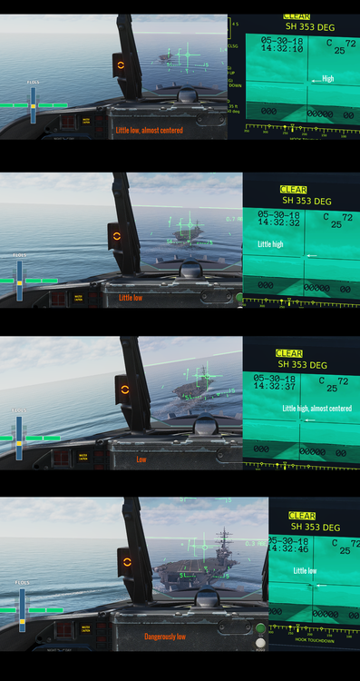 The plat cam crosshairs are too low, or the plat cam position or angle is off. When you're slightly below glideslope, the platcam will indicate that you are high. Not until you are very low, the aircraft shows below the platcam crosshair. This makes life hard for our LSOs. I hope this is a matter of a simple tweak! :thumbup: The screenshots shows paused moment of with the aircraft view on the left and the platcam view on the right. As you can see, they don't match at all. Trk included (for what it's worth in this case).