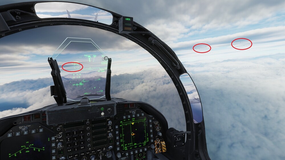 The dark dots are equally visible that far away if you look at the other examples. One of the weaknesses of the system is if the dots are dark, what happens in front of dark backgrounds? It’s possible to see bright aircraft very well without the dots against the sea for example. It’s as if the game is trying to compensate for the background by making them lighter. This is the Hornet Caucuses 8v8 BVR mission, give it a try. If this is only caused by clouds, the trouble is there are almost always clouds. Even in the Persian Gulf for some strange reason…