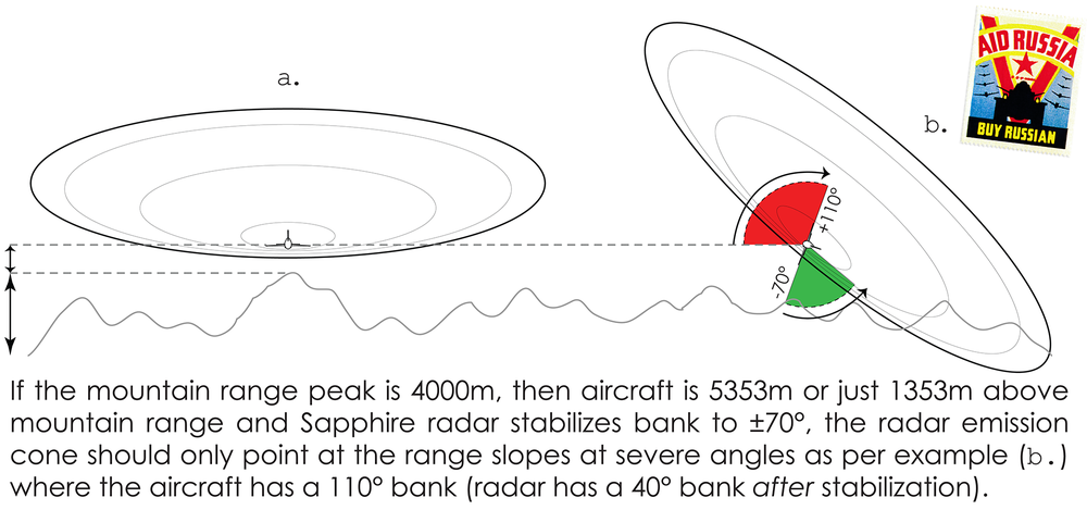 xxJohnxx wrote: "The ground clutter when pitching up being still visible seems to be correct, as the radar is self levelling within the following roll and pitch angles: Scan zone stabilization, bank angles: ±70° Scan zone stabilization, pitch angles: +8° climb -25° dive" That is fascinating, xxJohnxx, I didn't realize it was gyro-stabilized, but I think you may be confusing gyro-stabilization with manually directing the radar, please let me explain what I mean. DCS: MiG-21bis manual, page 137: "The Sapphire's antennae can't be manually moved up-down or left-right like in modern fighters. Instead, it will scan ±30° in azimuth, and -1.5° and +17° in elevation, searching for any targets at a maximum of 30 km distance." "Basically, you don't need to do anything except to fly at an appropriate altitude in order to actually "see" the target with your radar." So when you say it stabilizes to the horizon this makes perfect sense –otherwise it'd be getting return signals from mountains (within range) every time it banks. I've created a graphic with the radar emission cone (-1.5° to +17°) and you can see that even with mountains in front and slightly below the aircraft they do not enter the emission cone. And the gyro-stabilization you described means there should be even less ground returns! xxJohnxx wrote: "EDIT: Also talking about the minimum range of the radar of 500m, this probably has to do less with any sort of cone width, but more with the time it takes for the radar waves to travel from the radar to the potential target and back. They have to have some sort of intended (you have to filter out the reflections that the nose-cone itself creates) and possibly also unintended (response time of electronics) minimum range on that, which is probably the main factor for the minimum range of the radar." Thank you again for your input. IMO this is where the 'fixed-beam' mode would solve all these issues. The original ASPs were designed for use with ranging-radar and if I were designing this system I would simply use fixed-beam as ranging radar when in A-2-A gun-mode. The radar control switches are 3-way switches. [RV62] RADAR OFF / STNDBY / ON [RV64] GROUND FILTER OFF / ON / TILT ANTENNA UP +1.5° [RV66] FIXED-BEAM OFF / ON I would simply have 2 settings for Fixed-beam mode, A-2-G locked at -1.5° and A-2-A mode which would be a little wider, perhaps -1.5° to +8.5° so I could use the Fixed-net to aim the longitudinal axis (nose-cone) at an aircraft I was approaching and it would input the ranging information to the ASP to make its use more intuitive. --But that's just me. The signal-returns from the ground should be much weaker than a target, painted bright and reflecting un-refracted signals directly back to the antenna and IMO this would be how the Ground Clutter filter system would work IRL. It would simply ignore signal returns that are weaker up to a calibrated point. It could be done easily enough by the Russian engineers who created the whole thing back in the 50s. So the radar's gyro-stabilization should reduce ground return because (as the example I created shows, even with mountains in front and only slightly below the radar does not point at the ground by default! It points up! PS: I think your Youtube vids are really great. :-) -