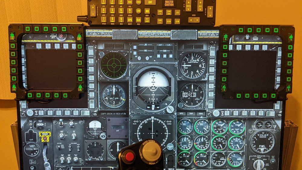 Please forgive me if this topic has already been covered. Also, please direct me to any threads covering this inquiry. While I love the ease in which Capt Zeens profile for the A10C II allows you to setup the viewports, what I am struggling with is the ability to modify his profile. What I'm wanting to accomplish is to have a profile more in line with Capt LozSM v2.1 profile where each panel(AHCP, Fuel, Landing Gear panel...) are all individual panels with their corresponding buttons/switches that I can move around and resize as needed. I have the Thrustmaster Cougar pack which I have mounted to the upper left and right corners of my 1920x1080 touchscreen that I would like to use. The issue with Capt Zeen's profile is that everything on the front dash is all on one layer and I can't move/resize each panel individually and get rid of the left and right MFCD frames/bezels. I've tried to use Capt Loz's SM v2.1 profile in the new version of Helios(1.6.3605.0) but I can't seem to get it to work properly. I'd also would like to make the panels look nice and new like in the game(non worn look) and have two Helios profiles, one that looks like the cockpit during the day and one that looks like the cockpit at night for night ops. I have attached some nice clean day and night panels so you can se what I'm talking about. I downloaded those images from the internet but I would like to know if anyone has extracted the new non worn panel images from the actual game. Here is a pic of my issue(A10 Setups) and an old photo(433) of my older setup using a non-touchscreen using Capt Loz profile that I modified slightly to fit my requirements.