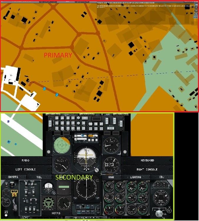 What is the resolution of your second monitor? Can you take a screen shot of the windows resolution screen with your second monitor highlighted. I forgot about adding your second monitors resolution to your overall res. Also, what procedure did you use to export your MFCD? Here is the procedure I followed. I followed the steps as indicated in the second post. I know PeterP could solve your problem in 2 seconds but I figured I'd try to help out. http://forums.eagle.ru/showthread.php?t=70716 When you are in the main menu for the game is the menu stretched over both monitors or does it just show up on your top monitor? I think there should also be a couple more sections in your .Lua file. Here is an example of my .Lua file sections; _ = function(p) return p; end; name = _('0utLAW Monitor'); Description = '0utLAW Monitor'; Viewports = -- Put your values in , and delete all exports that you don't want to use ! -- You will have to determine the area for the MP/SP GUI { Center = { x = 0; y = 0; width = 1920; height = 1080; viewDx = 0; viewDy = 0; aspect = 1.7; } } GUI= { x = 0; y = 0; width = 1920; height = 1080; } RIGHT_MFCD = { x = 1300; y = 1092; width = 392; height = 392; } More View Ports and then.... UIMainView = GUI Here is how my monitors are setup; -