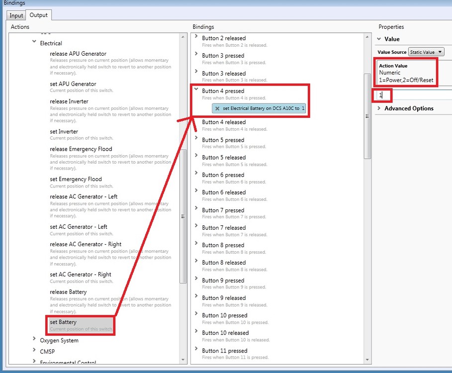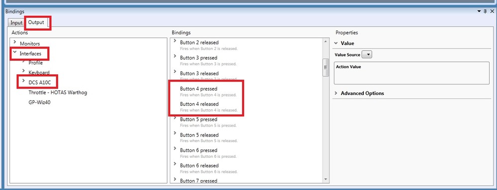 What I did was use CapLoz's profile and modified it to fit my monitor. Everything is already bound and if you want to know how to set up bindings take a look at some of the dials and switches already bound. It was a little confusing for me at first but after spending about 10 minutes looking at switches that were already setup it was pretty easy to figure out. I would start with simple On-Off toggle switch assignments. Here is an example of how bind the Battery Power On-Off switch; 1. Make sure your profile has the DCS A-10C interface set up correctly. Once you select "Setup DCS A-10C" you should get the following window confirming so; 2. Now add your interface board. Just like adding the A-10C interface go to "Profile/Add Interface". You should see your interface board in the list. Select it to add it. 3. You should now have three tabs. One tab for your Monitors Layout, another for the DCS A-10C interface and a third for your Interface board. Assuming you have switches already connected to your interface board you should be able to flip a switch and tell what number it correlates to in the interface. For this example I'm assigning button 4 to the battery power switch; Now that I know what the switch number is I can now assign it to a function. 4. Go to your Interface Boards tab and on the bottom go to the Output tab. You should see all your available buttons in the Bindings column. As you can see Button 4 Pressed and Released is not assigned anything as indicated by NOT having the > arrow to the left of it. (See next image) 5. Now in the Actions section hit the Interfaces drop down and do the same for the DCS A-10C dropdown; 6. Scroll down the list until you find the panel you want to assign. For this example it's the Electrical. Now hit the drop down and find the function you want to assign. For this example it's the "set Battery" ; 7. Now click on the words "set Battery" and drag and drop on to the words "Battery 4 pressed". You should now see an > arrow to the left of "Button 4 pressed" and a sub window stating "set Electrical Battery on DCS A10C to". Now all you have to do is set the "Action Value" as indicated by the Action Value options just to the right in the Properties section. I set it to 1 which as indicated by the "Action Value" options available (1=Power, 2=Off/Reset). This means when the button/switch is on it will set the Battery Power switch in DCS to on; 8. Now drag and drop the same "set Battery" word from the Actions column to the words "Button 4 released" and set the "Action Value" on the right to 2 which equals Off/Reset; ****VERY IMPORTANT**** 9. SAVE YOUR PROFILE 10. Relaunch your Helios profile from the Control Center icon. Now start up DCS A-10C and go to the intro on how to start up the aircraft and test your setting. Anyone please let me know if I have missed any thing or have any wrong information.