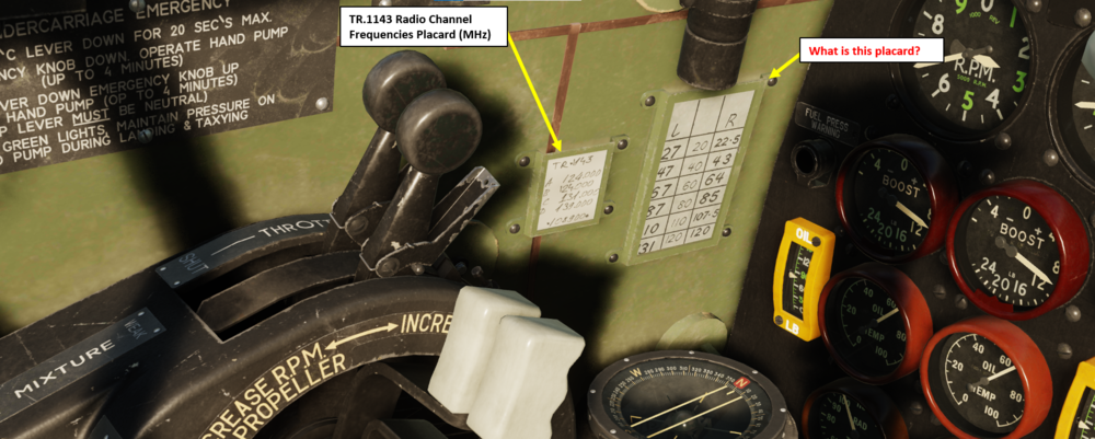 On the Engine Data Plate behind the throttle, the text reads: Automatic Supercharger Gear Change Switch Operates at 21000 ft •For Maximum Combat Climb – AUTO •For Maximum Lever Speed – MOD. Up to 23500 ft Merlin 113 & 114 The "Maximum Lever Speed" line should read "Maximum Level Speed". On the Undercarriage Emergency Placard, there is another typo on point 3. It says "op to 4 minutes" instead of "up to 4 minutes".