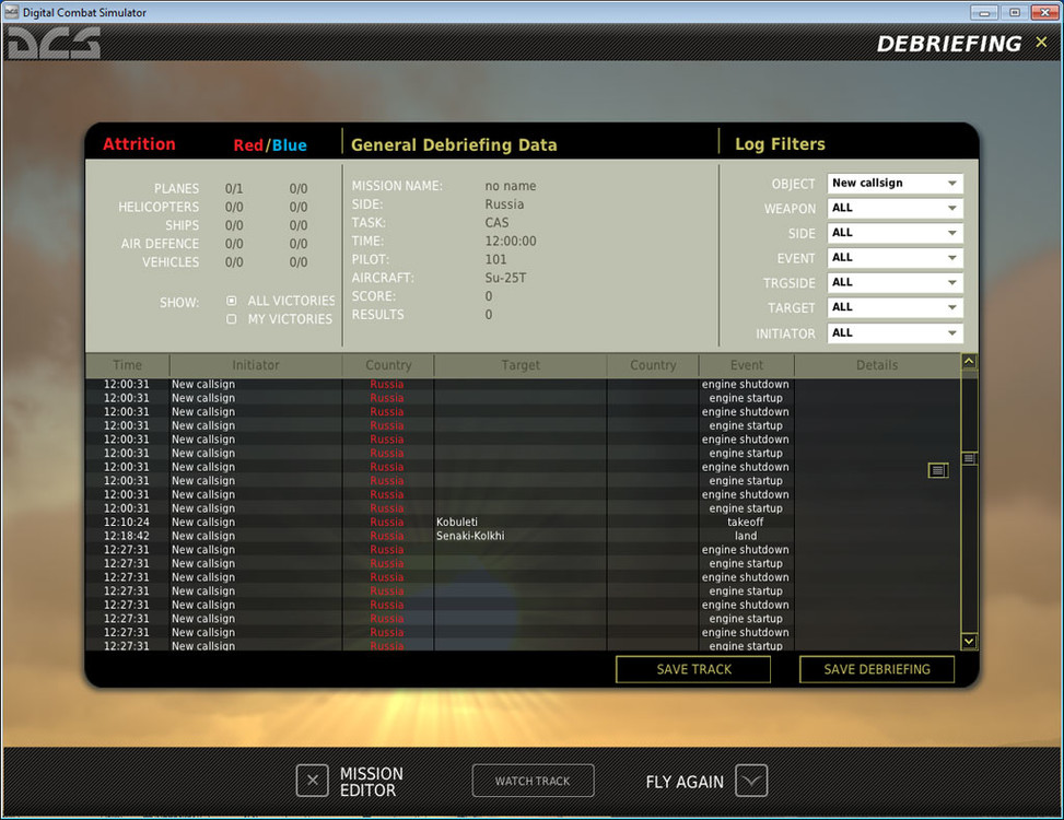 Briefing-Debriefing Весьма странно ведёт себя журнал событий после вылета, ("фотографировал" на предыдущей версии, но и в настоящей поведение не изменилось). Ну и пара косметических недоразумений: ползунок, по-моему, не совсем такой, каким задуман и кнопка "mission planner" не сцентрирована. Уж не знаю, насколько серьёзны эти недоразумения, но пусть будут, на всякий случай, в списке.