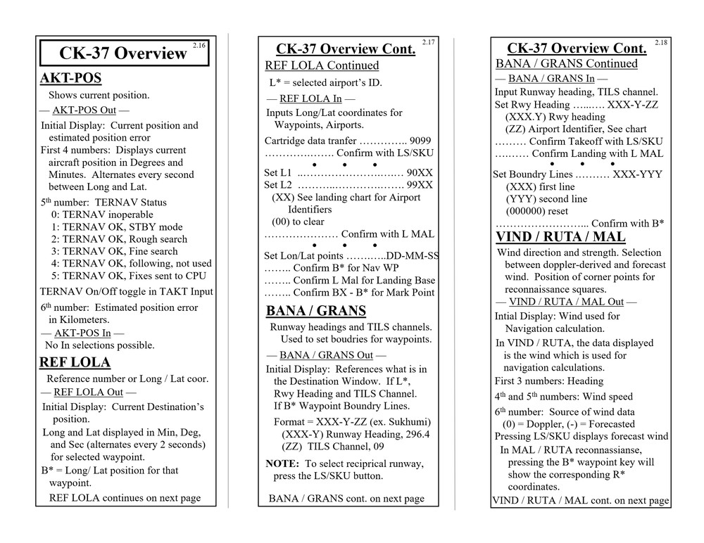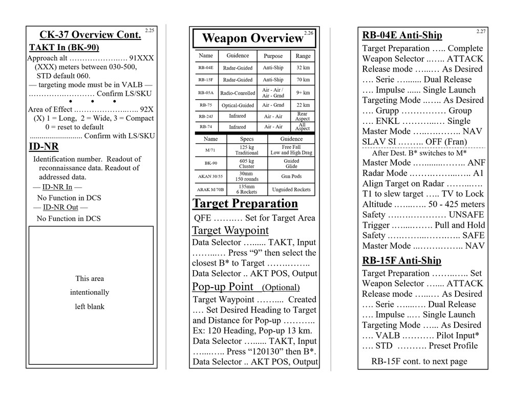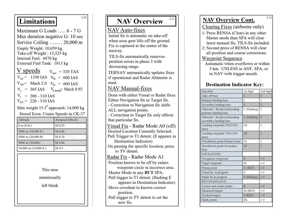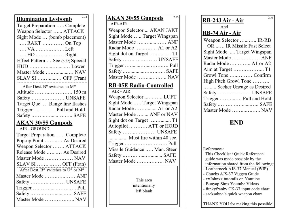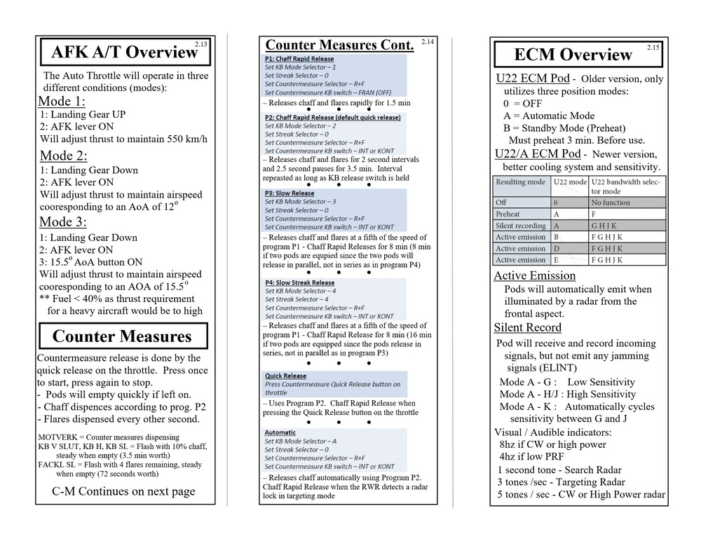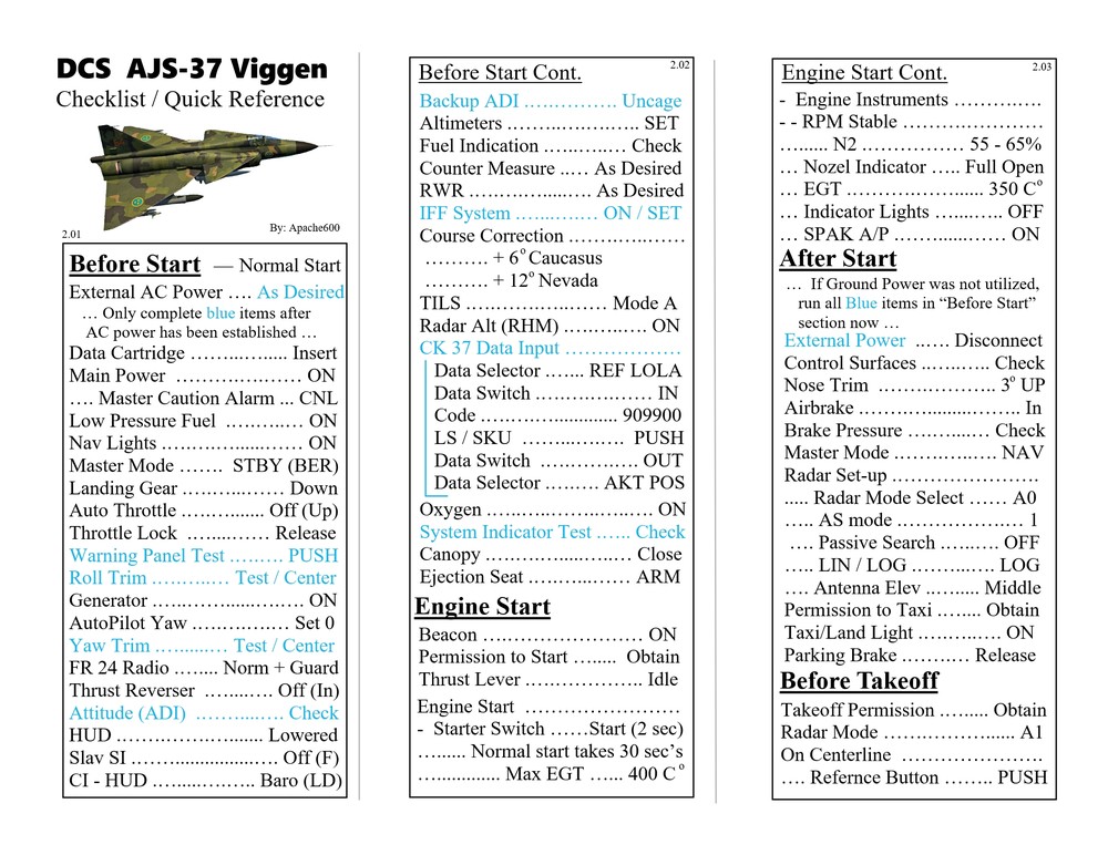 Hello everyone, Updated to VERSION 2 Binder edition I'd like to share with you the Checklist / Quick Reference guide that I created for the AJS-37 Viggen. Feel free to download them from the attachments below (scroll all the way down to the bottom of this first post. there's 12 pages in total), or by clicking the link above the sample pictures. That is a single PDF that contains all 12 pages. Those 3 pictures are what the pages look like. (shrunk down so they're not obnoxious). Here's the new Binder Addition! :book: (2 additional pics below) Link to the v2.0 binder edition here --> https://drive.google.com/open?id=0B8D9__Jf0wgITDRGWnlMdUJ2TGM I printed this at Staples and then cut off the access margin's. Total was $14.00 :disgust: But that included the binding, clear plastic front and black vinyl back. It was also printed on a more durable 110lb paper. I made these with the idea of having them printed, and not for the in-game kneeboard for VR. These are similar to my SU-25T and MiG-15 checklists. Version 1 was pretty much a monstrosity. Remove, delete, reformat, Do whatever you need to do to trash that garbage. haha. This version improves upon the old one in every way. Checklist that doesn't double up, or use non-existent commands. Better flow to the CK-37 portion. Weapons references are refined. etc. Again though, if there is anything that looks out of place, incorrect, or incomplete. I know my "Emergency" section is a little lacking, but I hope to elaborate more in that section in the future, and I still need more data on the Recon stuff, so that portion has a pretty large blank space set aside. Thank you everyone! Fisherman82 did a great job with converting the text of this Checklist/Quick Reference guide from English to Swedish! Here's the link to his post where you can find it: https://forums.eagle.ru/showpost.php?p=3139182&postcount=27 - Apache600 Google Drive link to the PDF file (so you don't have to download all 12 pages individually): https://drive.google.com/open?id=0B8D9__Jf0wgIeVUtUHZqTE4yb28
