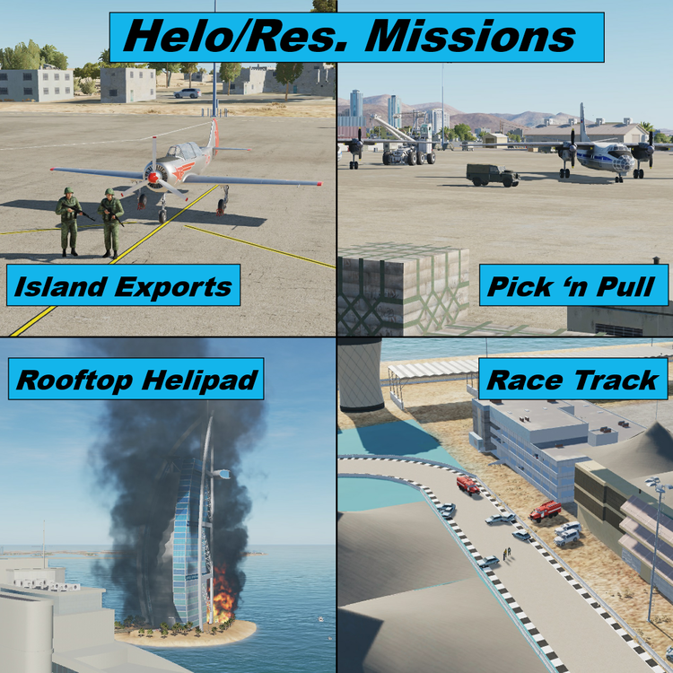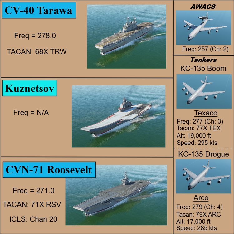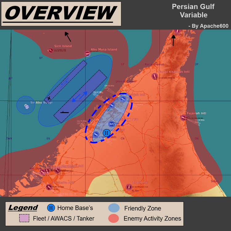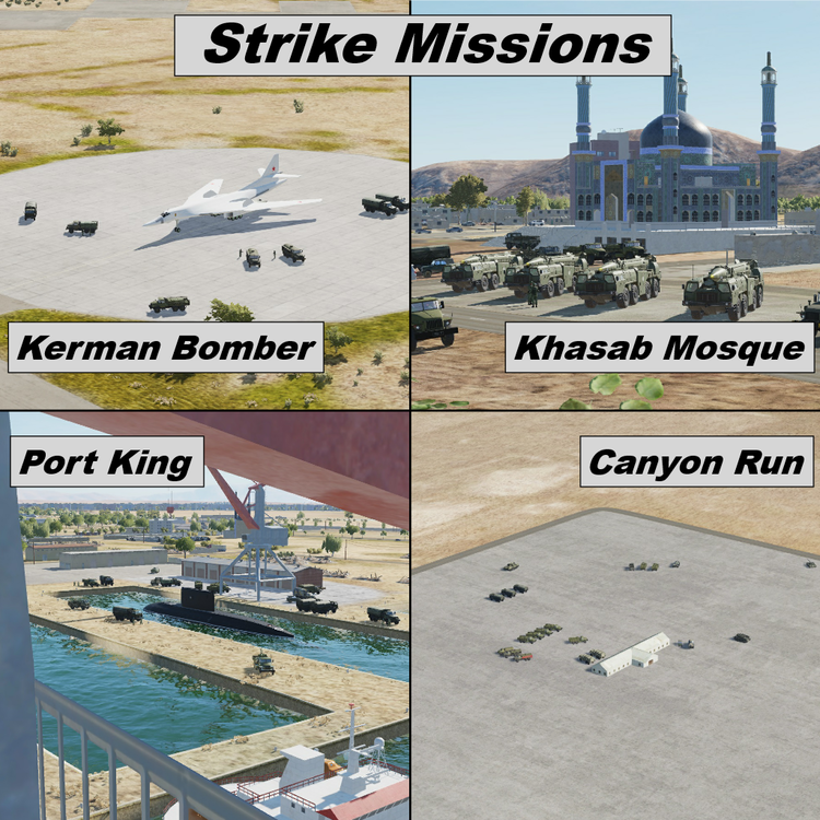 Persian Gulf Variable Download Link: https://www.digitalcombatsimulator.com/en/files/3314051/ This is an all-in-one style Air-Ground, Air-Air attack mission for the Persian Gulf map, and supports every flyable platform in DCS. There are over 50 different missions that can be played inside this one mission. In order to activate a mission, you MUST select it through the F10 radio menu option. Once completed with a mission, you will have the option of selecting a new mission. If you selected a mission that you no longer wish to complete, or have selected a mission in error, you can use the "Auto-complete" radio option to delete the units and go back to the main menu. ** NOTE - if you select the "auto-complete" option, you can no longer attack that missions units in the future. ** ** Special Notes for Platforms Spawn Locations can differ depending on what you want to fly. Dynamic Spawns are available for every platform and are located at the following: All Jet aircraft are located at Al Minhad AB. All propeller and helicopter units are at Sharjah. Sea based Dynamic Spawnable platforms will also be present on the carrier fleet. Standard Spawns, which are all the “Rescue” platforms (required for a rescue strike mission) are located at Al Maktoum AB. There are also sea based “Rescue” aircraft based on the aircraft carrier fleet. None of the aircraft have ordinance already loaded. So don't forget to load something! For the Rescue/Transport Missions, only helicopters, CEII, and the Harrier can complete the RoofTop Helipad mission. All other Rescue/Transport missions can be completed by any airframe. Ground Mission Difficulty definitions: Unattended Depots: No enemy return fire. Easy - Intended to be completed by a single player. Air defense includes small arms and vehicle mounted machine guns. Medium - Can be completed by a more competent single player, but really intended for 2+ players. Air defense includes AAA vehicles (guns) some with radar capability. And a possible short range IR SAM unit. Hard - Intended for a small group, or team, of players. Air defense includes multiple SAM's, both IR and Radar. Very Hard - Intended for a team of players. Air defenses are extremely formidable. Air Mission Difficulty definitions: (These missions are mainly built for 1-2 players, except for the "Large Cap Group's" air missions. Those are more suited for larger groups of player's flying together.) Their difficulty ratings are as follows: Easy - Either a few non-retaliatory aircraft, or a single fighter or two with guns only. (Vietnam and Modern enemies may have IR missiles) Medium - One or more retaliatory aircraft. Short range missiles possible. Hard - Multiple retaliatory aircraft with possibility of both short and long range missiles. For “Large CAP Group’s” all difficulties have A-A missiles. Mission List: - Unattended Depots: 4 Missions - Easy Missions: 9 Missions (2 are long distant) - Medium Missions: 10 Missions (3 are long distant) - Hard Missions: 9 Missions (2 are long distant) - Very Hard Missions: 6 Missions (all are long distant) - Strike Missions: 4 Missions - Rescue / Transport: 4 Missions - Air-Air Missions: 7 Genres, with 3 missions inside each (4 in Bombers/Transports) AWAC's is available at 257Mhz (Chan 2 for aircraft that need it, Chan G for Viggen) AWAC is set to Immortal and Invisible. Tanker aircraft are KC-135’s Texaco operates a boom. Freq 277Mhz (Chan 3) Arco operates 2 Drogue Baskets. Freq 279Mhz (Chan 4) Tankers are set to Invisible. If the tanker runs out of fuel, or is destroyed, a new one will spawn (only 2 additional spawns for each tanker). Update Log: v1.9: Every Jet platform can Dynamically Spawn at Al Minhad. Every Propeller and Helo platform can Dynamically Spawn at Sharjah. “Rescue” platforms have traditional spawns at Al Maktoum for trigger requirements. Reworked trigger system so that “Rescue” platforms are the only ones that can achieve success for the rescue mission. Fixed various trigger issues with Long Distance and A2Amissions. Added “mission completion” text box in F10 map. v1.8: Fixed Script problem that caused CTD every time a guided munition hit a target v1.7: Added 4 F1-CE’s Added 3 MB-339 Placeholders Added Road Base FARP deep in Iran (briefing image included) Added Link 4 and ACLS to Super Carrier Fixed unit loading area with Mission: Long Distance Dam Beset Condensed strike and helo mission briefing images together Lowered cloud height about 1,000 feet because of confliction with tanker (reduced overall file size by 22.5% / 6mb) v1.6: All Blue flights coalition changed to Blue Task Force Added 4 AH-64’s Fixed coordinates in Briefing and Kneeboard for #11 (thanks Aurora) v1.5: Added 4 Mosquitos Briefing updated to show Special Platform add-on notes (i.e. No I.R. suppressor or NS430, etc.) for certain platforms Fixed triggers in Pick n’ Pull mission so sound files won’t step on each other v1.4: Added 4 Mi-24’s Added 4 AH-64 Placeholders Added 3 F4U Land Placeholders Added 4 F4U Sea Placeholders Added 4 Mosquito Placeholders Fixed spelling error in Briefing Page / Kneeboard Fixed incorrect Freqs for Tarawa and Roosevelt v1.3: Updated atmospheric conditions for new cloud system. v1.2: Beach Landings no longer stays after returning to F10 main menu Some enemy ships moved back closer to shore after ED bug fix. Place holder text in Helo air - air easy removed. Trigger sequences for multiple Air-Air briefings and victories fixed. v1.1: Problems with rescue mission pickup and dropoff triggers. No more “smoke” message when delivering package to Dubia. Mountain Rest mission played wrong sound track. Added additional time for player to land on Helipad in Roof Top Rescue. Fixed a few triggers associated with Khasab Mosque strike mission. Units at Artillery Zone in Oil Farming mission no longer Disperse. Added “distance” next to each mission name in F10 menu. Commodity Center destruction fails it’s associated Easy missi