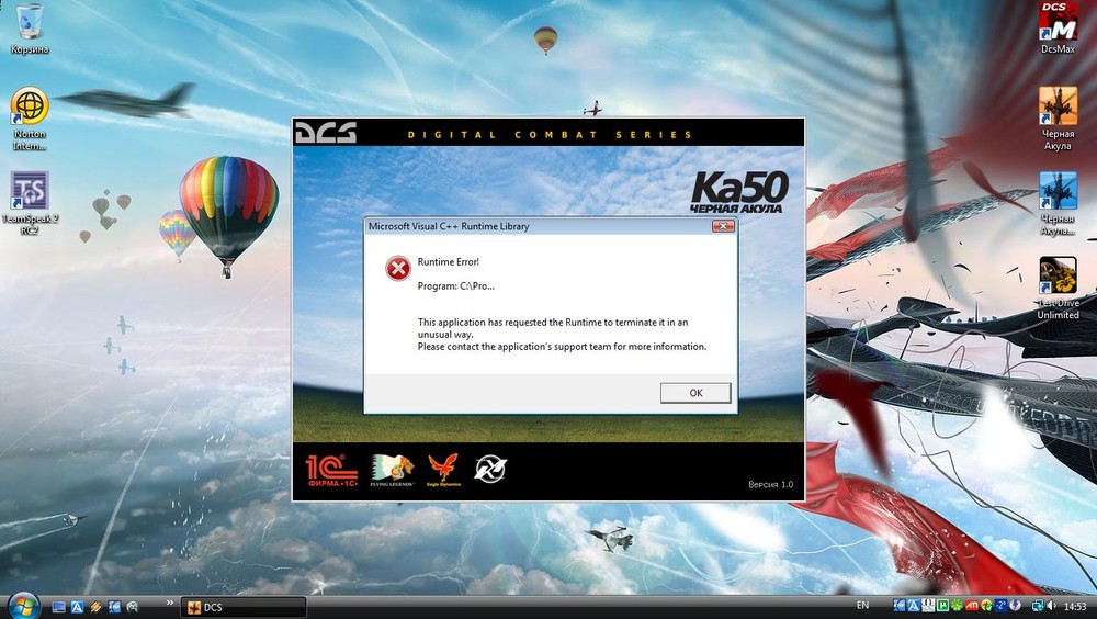 Не запускается вообще под Висту на топовой машинеLEDNIC7771 replied to Aspid's topic in Баги и Проблемы Нашёл у себя причину отказа запуска игры по причине VisualC++ . Это была программка использующая при инсталяции свою библиотеку C++ . Отсюда какой делать выбор : или эта программа или игра ? :huh: Всё-таки , считаю нужно Вам доработать Ваше приложение :joystick: ! Но несмотря на все эти заморочки игра продолжает вылетать в мультиплэере по той же ошибке C++ Runtime .... Но вроде пишут , что в патче пофиксят . Поживём - увидим :pilotfly: