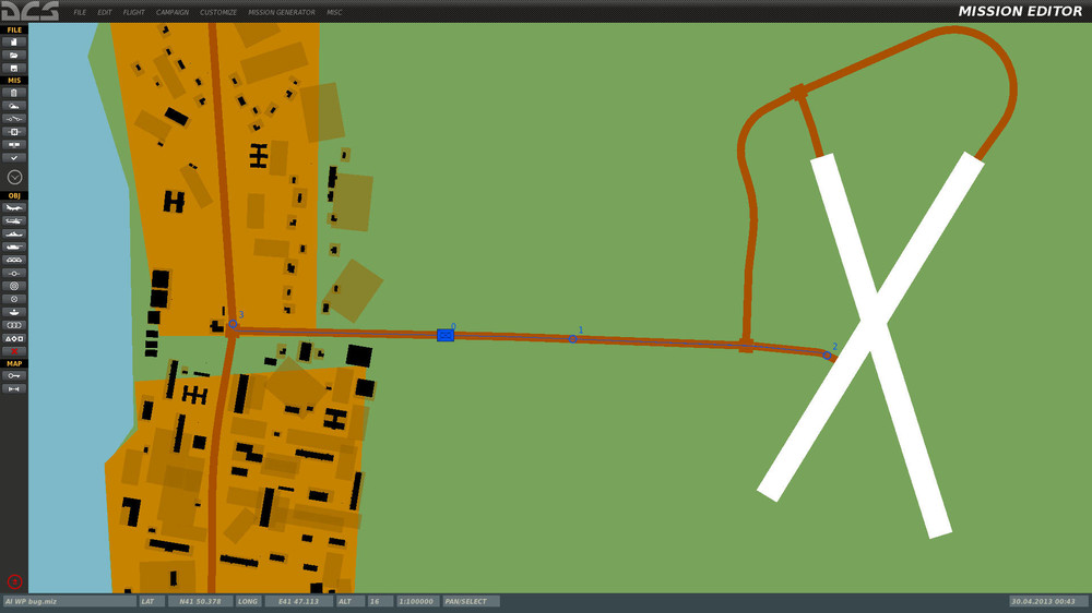 I have found a problem that causes AI to ignore waypoints. Look at the attached image. The blue Stryker unit should drive to the airport and then turn and drive to the city right? Well, it usually does. However, i have added a hold condition to WP1. The Stryker will hold at WP1 until Flag 1 gets true, which is done using a Radio F10 menu option. When i wait until the Stryker stops at WP1 before i set the Flag, the Stryker will follow the complete route. However, when i set the Flag before the Stryker reaches the WP, the unit will turn at WP1 and will drive to WP3 directly. It just skips WP2. I also have done tests with advanced waypoint action. My tests show that the turning waypoint's (WP2 in the example without scripts) advanced actions a are executed, while the advanced waypoint actions of other skipped waypoints arent. This can be seen by the tracks with scripts. The zip contains the two missions (with and without scripts) and two tracks for each mission, one with waiting for the Stryker to stop (the CORRECT ones) and one without (the WRONG ones). I would like to read any comments on this bug. AI WP bug tracks and missions.zip