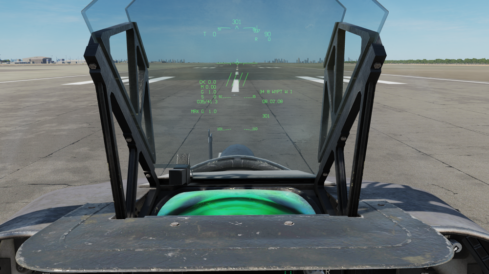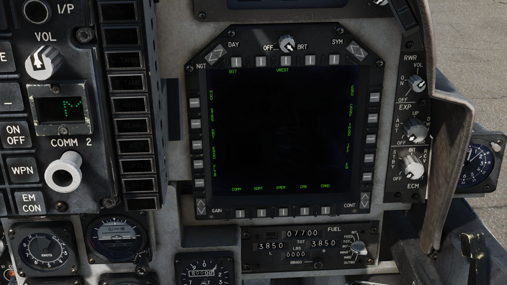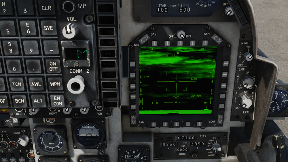 Okay, with all this discussion about the FLIR system in the Harrier, I thought I would throw this out there. When you bring up the menu to select the TPOD, there is also another selection for FLIR. What is the difference between FLIR and TPOD? Can this other FLIR be used for targeting? Where is the sensor? Here are some screen shots. The first one is the menu with TPOD on the right side and FLIR on the left. The second one is the TPOD page, the third is the FLIR page. I'm just wondering what this other FLIR is for. The fourth screen shot is for my second question. Whenever I go into A/G mode, I get these four short slashes in the middle of my HUD. What do they mean?