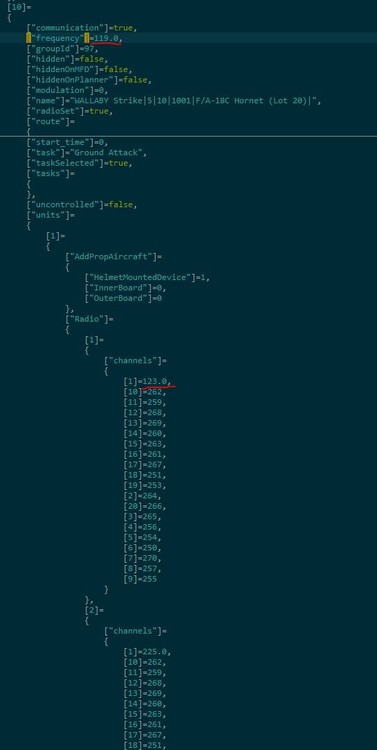 Within the miz file itself the values don't match. The editor likely is displaying whatever is in the frequency box for channel 1 of the first radio because by its rules if you change one it will change the other. So it is assuming the value in channel 1 is the value in frequency and for whatever reason isn't showing the actual value in the miz. If you re-save it then it'll rewrite the value in channel 1 to actually be 119. It is the file that is generated by Liberation. Don't know if it just creates some default frequency for each group and any custom radio preset separately or what. The radio checkbox is a group toggle for whether or not that group will broadcast messages over their radio. Set to false you won't hear that group, set to true you will. Just an easy on/off so the user doesn't have to add and set 4 different options for that flight.