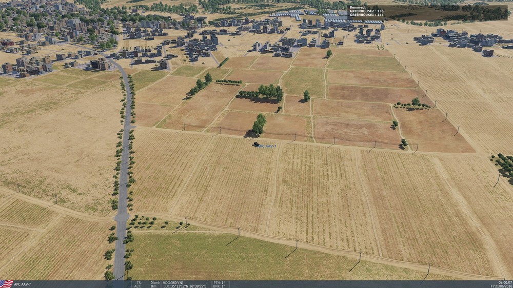 This is the script used in the attached mission. local foundUnits = {} local deleteThis = {['GREENHOUSE1'] = true, ['GREENHOUSE2'] = true,} local sphere = trigger.misc.getZone('zone') local volS = { id = world.VolumeType.SPHERE, params = { point = sphere.point, radius = sphere.radius } } local ifFound = function(foundItem, val) local tName = foundItem:getTypeName() if deleteThis[tName] then if not foundUnits[tName] then foundUnits[tName] = 0 end foundUnits[tName] = foundUnits[tName] + 1 foundItem:destroy() end end world.searchObjects(Object.Category.SCENERY, volS, ifFound) local msg = {'Removed: \n'} for tName, val in pairs(foundUnits) do env.info(tName .. ' : ' .. val) msg[#msg+1] = tName .. ' : ' .. val .. '\n' end trigger.action.outText(table.concat(msg), 20) remove_hippy_farmers.miz