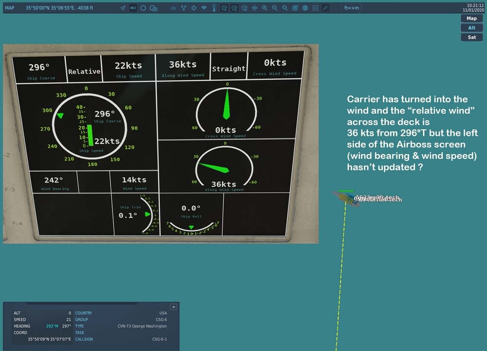 Unfortunately the Relative Wind direction and magnitude on the Airboss's screen doesn't update when changing the carriers speed or direction - so even if you bring the carrier to a full stop, you can't see the meteorological wind across the deck. Here, I've turned the carrier into the meteorological wind and adjusted the course so the crosswind needle is centered i.e. at 0 kts ... this is far from ideal, but I'm at a loss for what else you can do if the briefed wind direction changes and isn't updated in the mission brief (LALT+B).