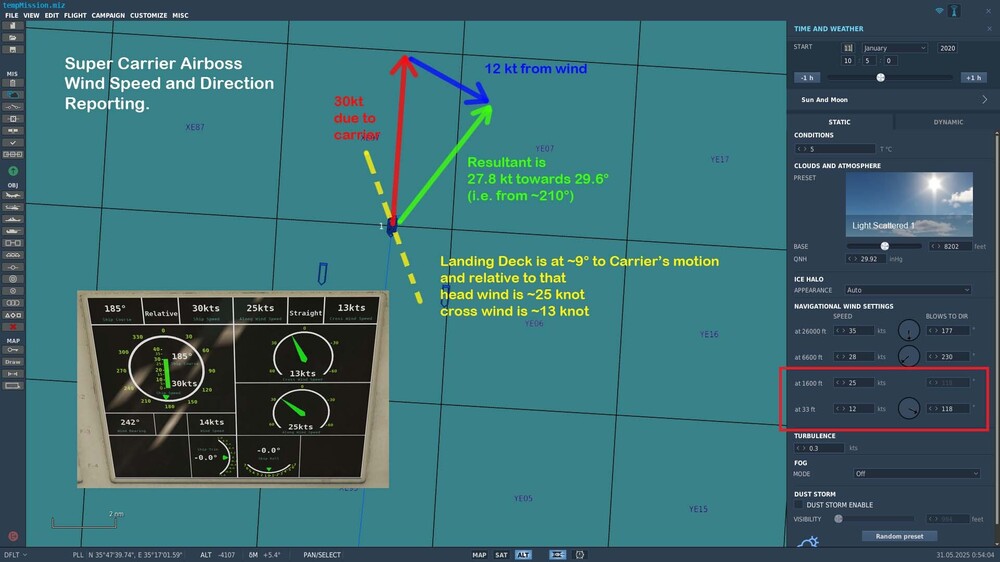 Apparent wind: Apparent wind is the wind experienced by a moving object, like a sailboat or an aircraft, and is a combination of the true wind and the object's speed and direction. Relative wind is the direction of the airflow relative to the moving object (carrier), rather than the true wind direction. Comment: AFAIK the Airboss screen's "relative wind" direction is only calculated at mission start and doesn't update when changing the carrier's speed/direction or switching to a new player slot. The magnitude of the Airboss's "relative wind" only considers the metrological wind component (perhaps adjusted for deck height) and doesn't include the additional component due to the carrier's own speed/direction. Dynamic weather adds cyclone type weather systems to DCS and metrological wind direction and speed can/will vary with the carrier's location i.e.