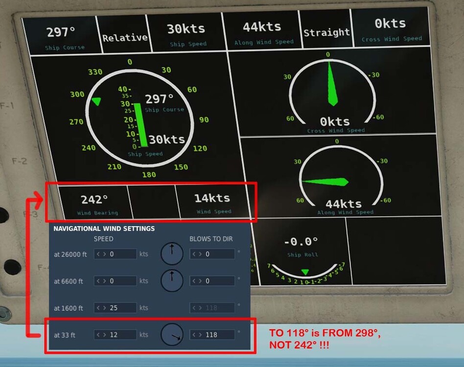 Not sure if everything is reported correctly on the "Airboss's Windspeed/Direction Screen" but neither 118° or 298° is close to the resultant wind across the deck due to the carrier's speed/direction combined with the meteorological wind in the mission. This diagram might help ? Comment ARCTAN (25/13) = ~62° so the wind direction from 242° in DCS is perhaps derived from the "measured ?" landing deck headwind/ crosswind components (and ED are modelling real life rounding errors, instrument limitations or similar ?) However, the magnitude (14 kts) of the wind doesn't make sense (to my eyes) as (from Pythagoras theorem) the landing deck wind components equal 28 knots i.e. • √ ( 25² + 13² ) = √ ( 625 + 169 ) = √ ( 794 ) = 28 kts but perhaps I'm misunderstanding what is being displayed in the bottom left of the Airboss's screen ?
