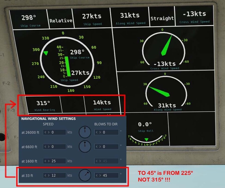 Just did a quick check - there's nothing fancy (or relative) here, it's just wrong. • wind to 90° is reported as 270° (correct) • wind to 118° is reported as 242° (wrong i.e. 118 + 180 = 298) • wind to 45° is reported as 315° (wrong i.e. 45 + 180 = 225) Looks like it was pure chance the Airboss's relative wind bearing of 242° in the OP's mission was in the same quadrant as the actual "relative wind" !!!