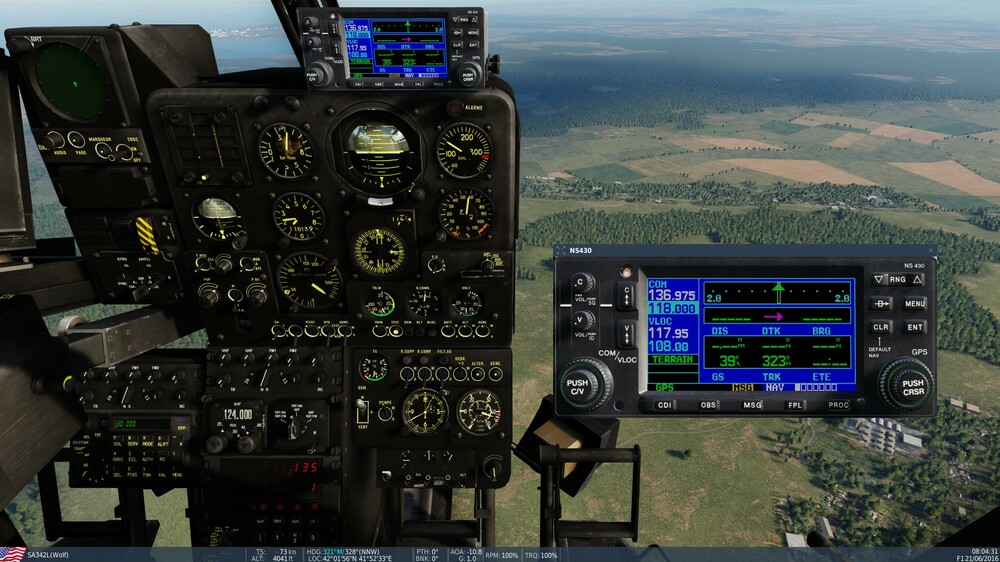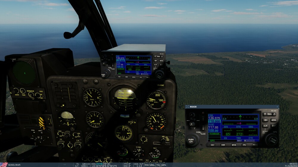 TL;DR: This bug seems to effect all modules tested (Hind, Gazelle and F-5E) - there is zero wind in the supplied track. • It seems the NS430 is doing a double km/h --> knots conversion. Detail: Setting the NS430 to display km/h, and flying at 120 km/h in the Gazelle • it displays 65 km/h i.e. 65 would be correct if it was displaying knots, as 120km / 1.852 km/nm = 64.8nm = ~65 Setting the NS430 to display knots, and flying at a Ground Speed of 135 km/h • it displays 39 knots/h because 135 / 1.852 = 72.894 (correct answer in knots) but divides it again 72.894 / 1.852 = 39.360 = ~39 Tested in DCS Open Beta 2.8.1.34667 -