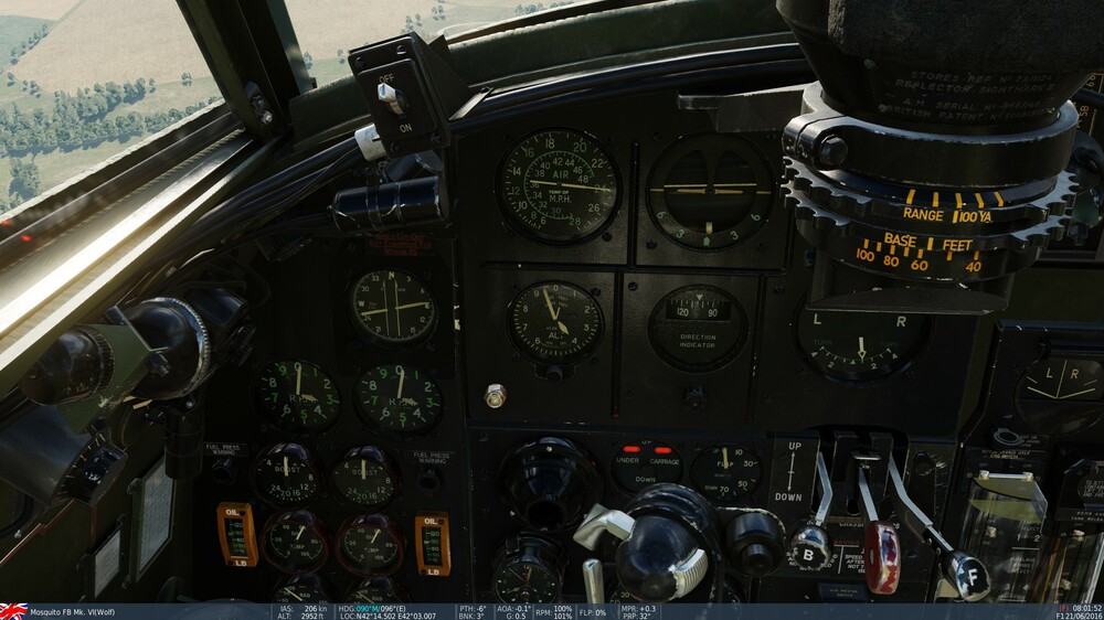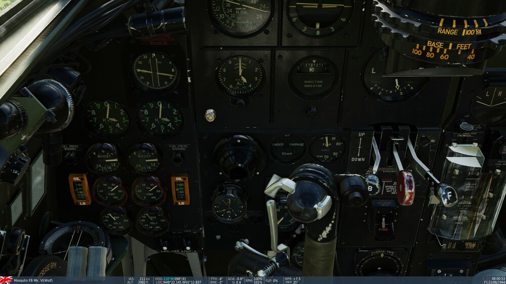 No, you are not missing anything I am aware of. Using 1944 and similar airfields - I see DCS reporting a heading/track of approx. 110°M (98°T) with a MagVar = -12°W The default air spawn Mosquito's DI read the WRONG bearing, 86° = 98°-12° was neither the Magnetic or True heading. [Perhaps the Mosquito's spawn logic is subtracting a +MagVar rather than using Magnetic = True - MagVar = 98°T - ( -12°) = 98° + 12° = 110°M ?] I therefore adjusted the DI to read 110°M (not sure why the dial compass was reading 138°M in the picture below - likely I was in accelerated flight or climbing/descending prior to taking the screen shot) Tacview reported the approx. True heading/track of 98°T as given by DCS (F10 map's vertical axis = True North). Note • LCtrl + Y will toggle the DCS cockpit info bar • Setting the DI needs to done flying straight and level as last time I checked, the remote compass was subject to magnet dip (while on the ground) due to the Mosquito being a tail dragger and DCS not modelling the remote compass's gimbal (seems common to all DCS tail draggers with RMIs). Tested DCS Open Beta 2.8.2.35759 using Normandy with mission date 21st June 1944