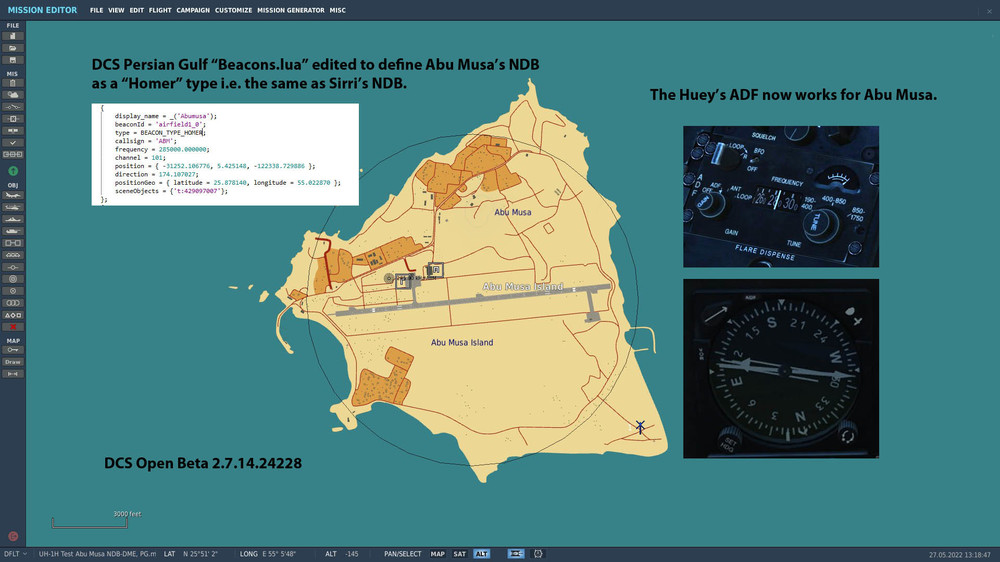 Abu Musa's NDB frequency is 285 kHz IRL and in DCS, however it's wrongly defined as a DME in Persian Gulf's Beacons.lua, so doesn't work for ADF. Abu Musa's default DCS NDB definition Sirri's NDB is correctly defined as a "Homer" in "Beacons.lua", editing Abu Musa to be the same beacon "type" allows it to work i.e. for the Huey's ADF Tested in Open Beta 2.7.14.24228