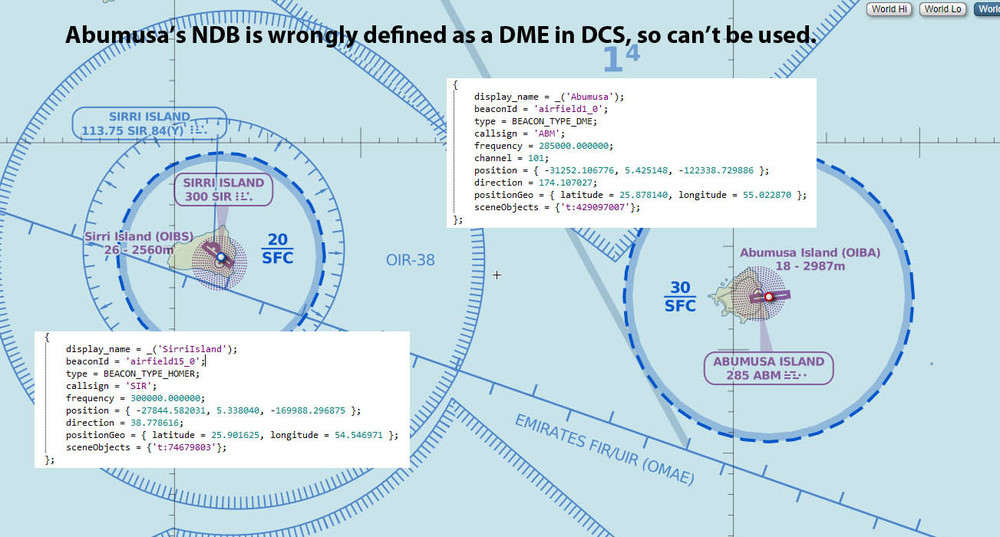 Note there are at least 2 other Persian Gulf NDB's with this issue in the current Open Beta. These NDB's BH and KER have the wrong frequencies (instead of kHz, they've been given MHz) • NDB BH 309 kHz --> 309 MHz • NDB KER 290 kHz --> 290 MHz ... and been given the wrong type • BEACON_TYPE_HOMER --> BEACON_TYPE_DME NDB BH NDB KER