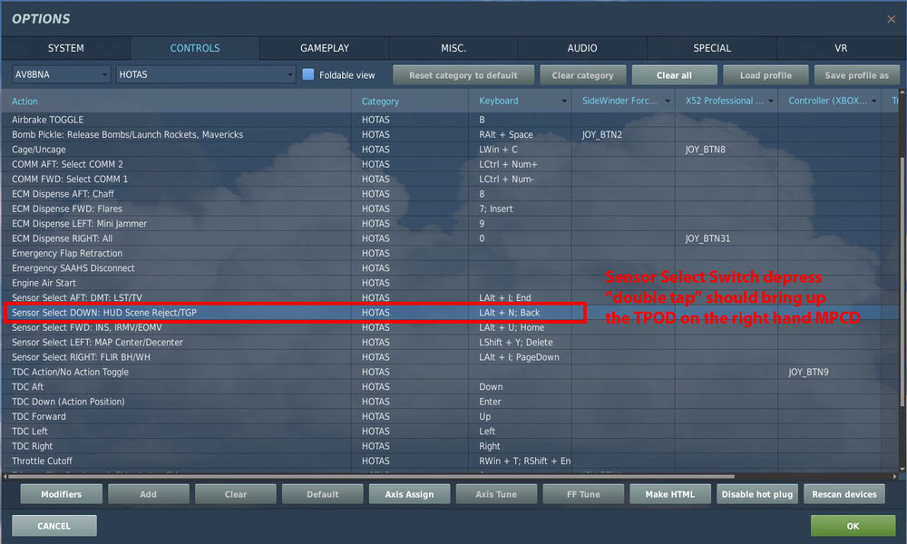 Yes, it's Sensor Select Switch depress double tap, to bring up the TPOD on the RH MPCD and Enter/Exit TPOD HOTAS Mode (HTS). The mode it'll start in will depended on the aircraft's current status i.e. is there a waypoint/target designation or similar to "slave to". You can see the SOI source and designation on the TPOD's display. If it's not in TPOD DES at first, it'll usually switch to that mode once you start/stop slewing the cross hairs (IIRC it's important for the slewing to stop, so if using an analogue axis - you may need to add dead zones to stop drift). Before switching to another mode/weapon, AFAIK the AV-8B requires you to create a Target designation using TDC depress "TDC Down (Action Position)" Here's a rather poor video of me using the TPOD to find target's to fire IRMAV at. @RebelCid If you still have issues please share a screenshot or short track (i.e. an air spawn) of you using the TPOD and I'll try to spot your problem.