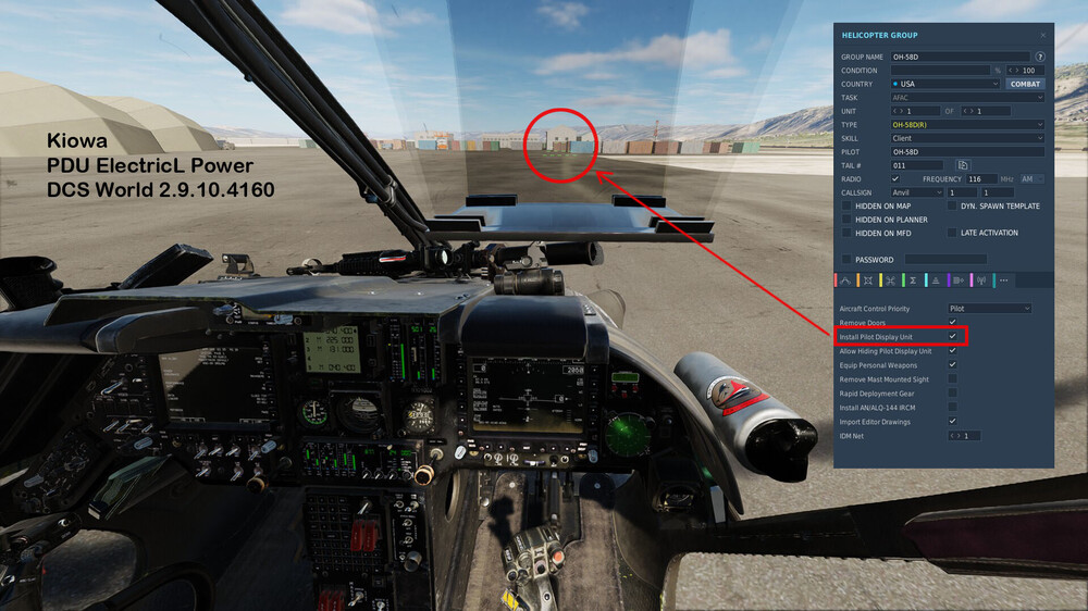 You MUST enable the Kiowa's PDU in the Mission Editor (it's off by default), otherwise the display does not work (the frame can be added/removed but will have no electrical power). Tested using DCS 2.9.10.4160 -