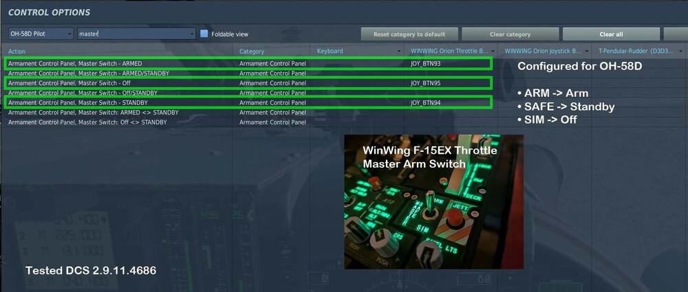 Assuming you are trying to use the Master Arm Switch on your WinWing F15EX Throttle ? I have no issue assigning the Kiowa's Master Arm Switch positions once in the Kiowa cockpit i.e. ESC -> Controls -> OH-58D Pilot Note that the other Master Arm Switch options are for toggle switches or spring centring switches that have no centre position i.e. Switch Armed ELSE Standby. If you are using a different device/switch ? Please explain in detail how you've setup your controls. Tested using DCS 2.9.11.4686 -