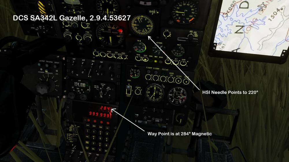 I can confirm the HSI "NADIR Double Arrow" no longer points to the correct WP azimuth. Switching the NADIR's Parameter Selector to TPS/CAP (WP Estimated Time / Heading) - the NADIR's WP heading reads correctly, so the fault is with the HSI needle. F10 Map Overview. I also confirmed the HSI's Waypoint needle was incorrect in a Caucasus Mission with zero wind. As reported here, the NADIR needle bug only appears to effect the SA-342L version.