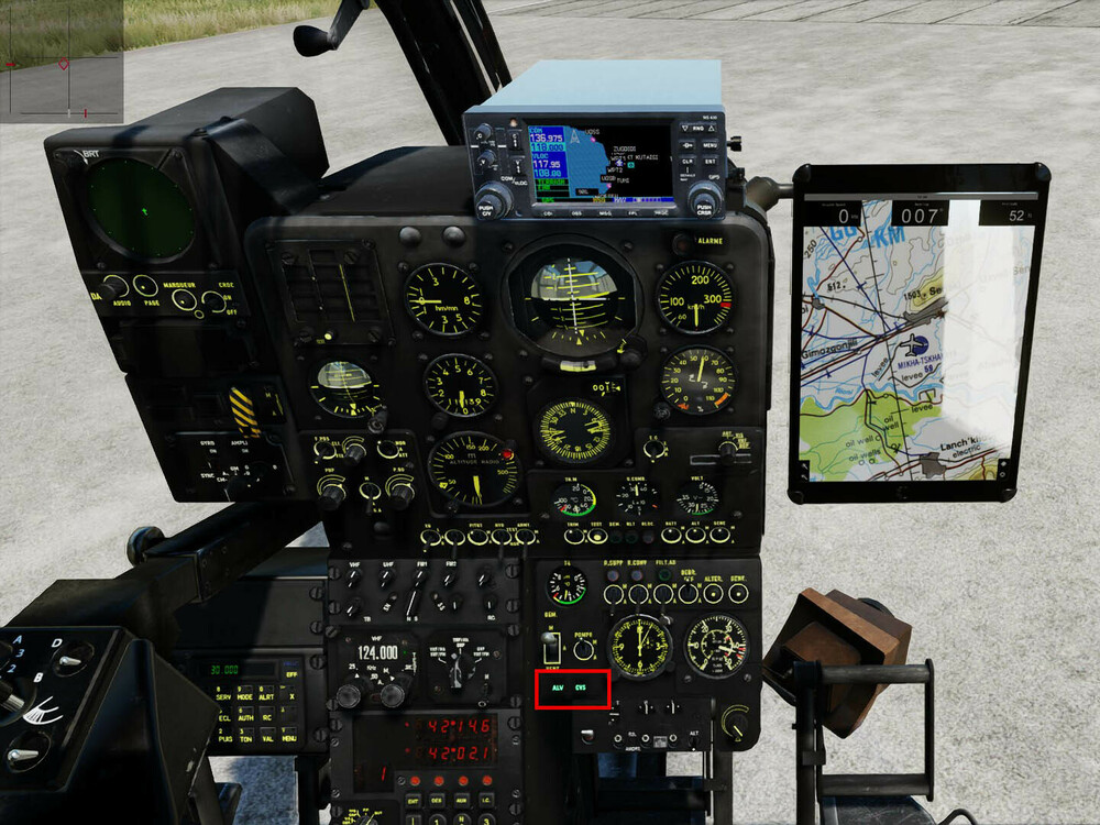 Below the main panel starter and pump switches are the CVS (hover) and ALV (slave to sight) lamps which are yellow when armed and green once active/in parameters. The slaved autopilot will try to track the periscope/Viviane sight which moves with helicopter body unless ground stabilized • for the L use the "Periscope Command Box" Stabilization toggle • for the M, the Viviane sight will ground stabilize after it's first manual slew Because of these issues, it's probably best to switch to the co-pilot seat first (with same control/axis settings as the pilot) and setup the Viviane/Periscope, before engaging the Hover and Slave modes. AFAIK the current autopilot Hover and Slave modes are still WIP due to the Gazelle's new/more accurate flight model. Gazelle L Autohover test, 2_9_3.trk -