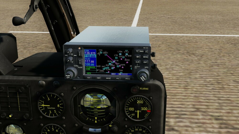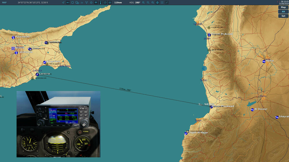 As said, any Airports or navigation beacons are read from the map files, so you can create regular flight plans or fly "direct" to a airbase, etc. Here's an example of what you'd see on the NS430 for Syria (note how the airfields and beacons are displayed but the coast line is missing). However, SIDS and STARS require additional data to be added to the NS430's database i.e. RNAV waypoints and fixes and the procedure(s) to fly them.