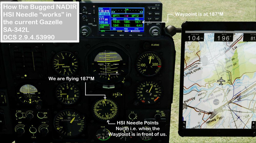 The HSI NADIR needle in the SA-342L is broken ATM i.e. it doesn't point to the selected waypoint as it should. https://forum.dcs.world/topic/347051-nadir-waypoint-issues/?do=findComment&comment=5415678 AFAIK the Gazelle's NADIR is working correctly in the M1 and Minigun versions.