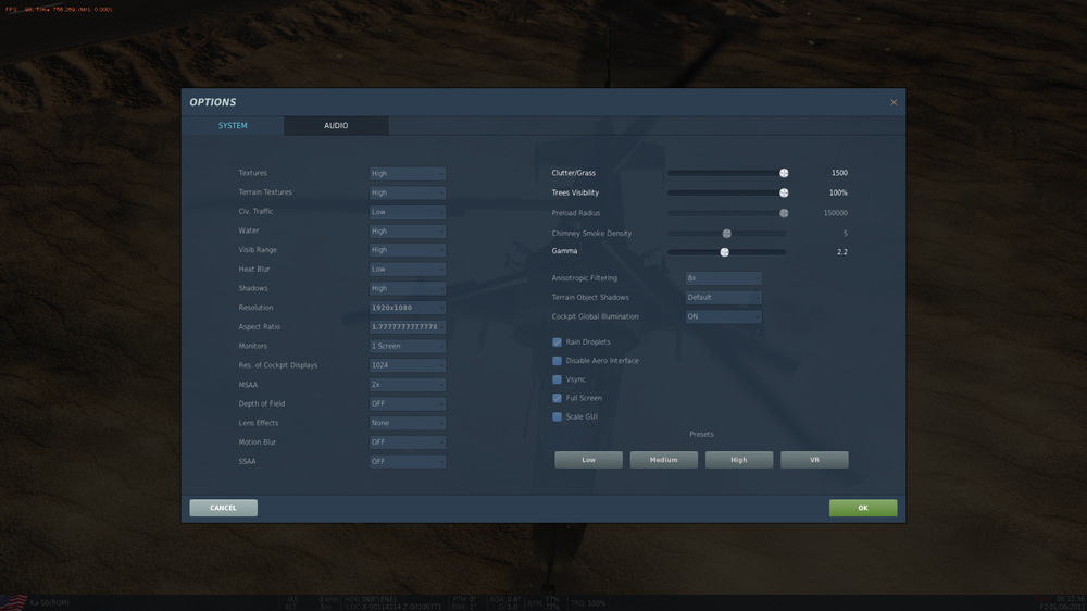 Hi, I did several tests and finally found the best graphics settings. Core I5-9600k at 4.8Ghz Memory Corsair Vengeance XPS 32GB MSI Nvidia RTX 2070 Gaming Z 8GB MSI Gaming Edge AC Z390 See attachments. Essentially I have FXAA on in NVidia MSAA 2x amd anisoptric 8x in DCS, texture object shadows are set to default (important!) I use 144Mhz Screen, so I use Fast VSync (My monitor is freesync not gsyc), so you will need to adjust according to your specs Would be awesome to get feedback on recommendations you guys have to make the graphics awesome. My main issue was shimmering on far away building where there is a lot of lines. I fly the helicopters, so flying low you notice these things.
