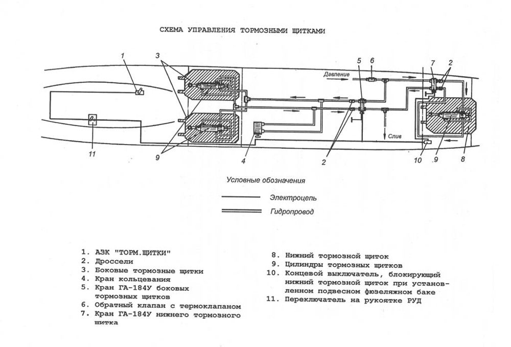 Между шпангоутами № 11 и 13 в нижней части фюзеляжа справа и слева расположены ниши передних тормозных щитков. В зоне шпангоутов № 22-25 внизу находится ниша и узлы крепления заднего тормозного щитка и его гидроцилиндра.