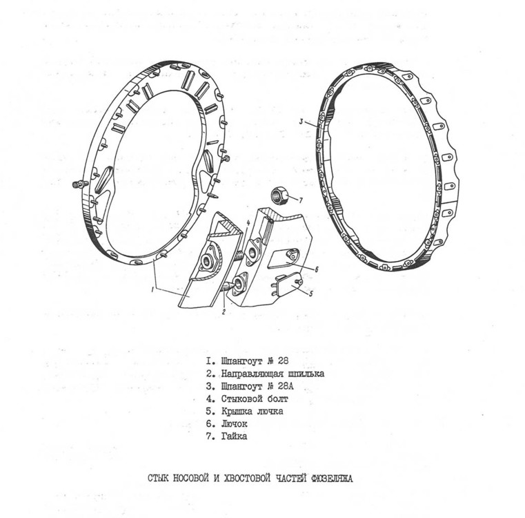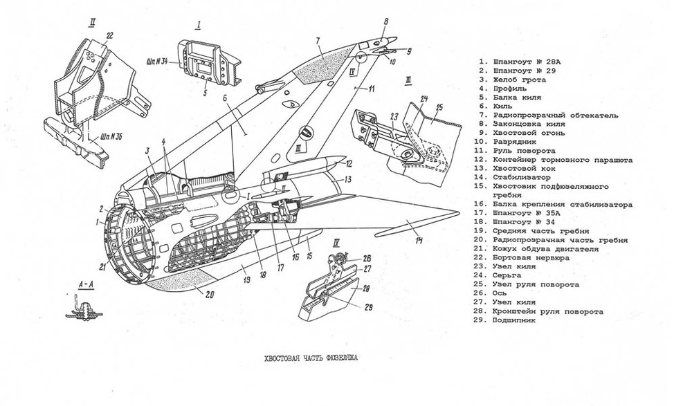 Каркас хвостовой части фюзеляжа выполнен в виде поперечного (шпангоуты) и продольного (стрингеры) силовых наборов. Поперечный силовой набор состоит из 13 шпангоутов, из которых силовыми являются шпангоуты № 28А, 34, 35А и 36. Стыковой шпангоут № 28А имеет восемнадцать стыковых точек со шпангоутом № 28 носовой части фюзеляжа. Продольный (силовой) набор выполнен из прессованных профилей уголкового сечения.