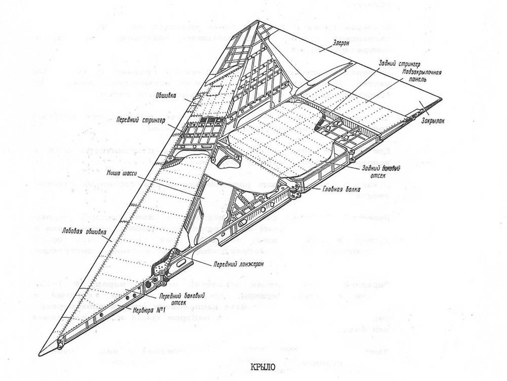 Крыло самолета треугольной формы в плане, с углом стреловидности по передней кромке 57º. Обводы крыла набраны из профилей с относительной толщиной у корня 4,2% и на конце 5%. На крыле установлены закрылки «плавающего» типа и элероны с осевой аэродинамической компенсацией. В каждой консоли крыла имеется ниша для размещения основной стойки шасси.
