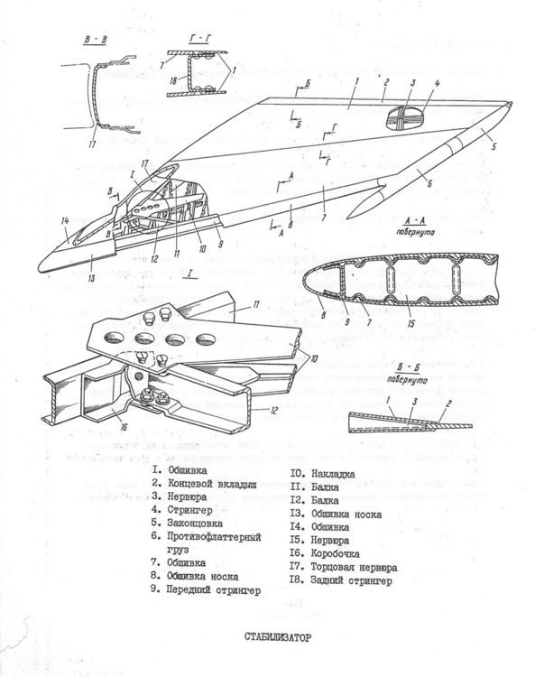 Горизонтальное оперение (управляемый стабилизатор) состоит из двух половин. Основными элементами конструкции каждой половины стабилизатора являются стрингеры, две силовые балки, набор нервюр и обшивка.