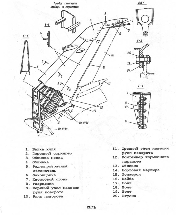 Вертикальное оперение самолета состоит из киля и руля поворота, который крепится к узлам киля в трех точках. Киль жестко закреплен на хвостовой части фюзеляжа по шпангоутам № 34-36, а также заклепками к стальным угольникам.